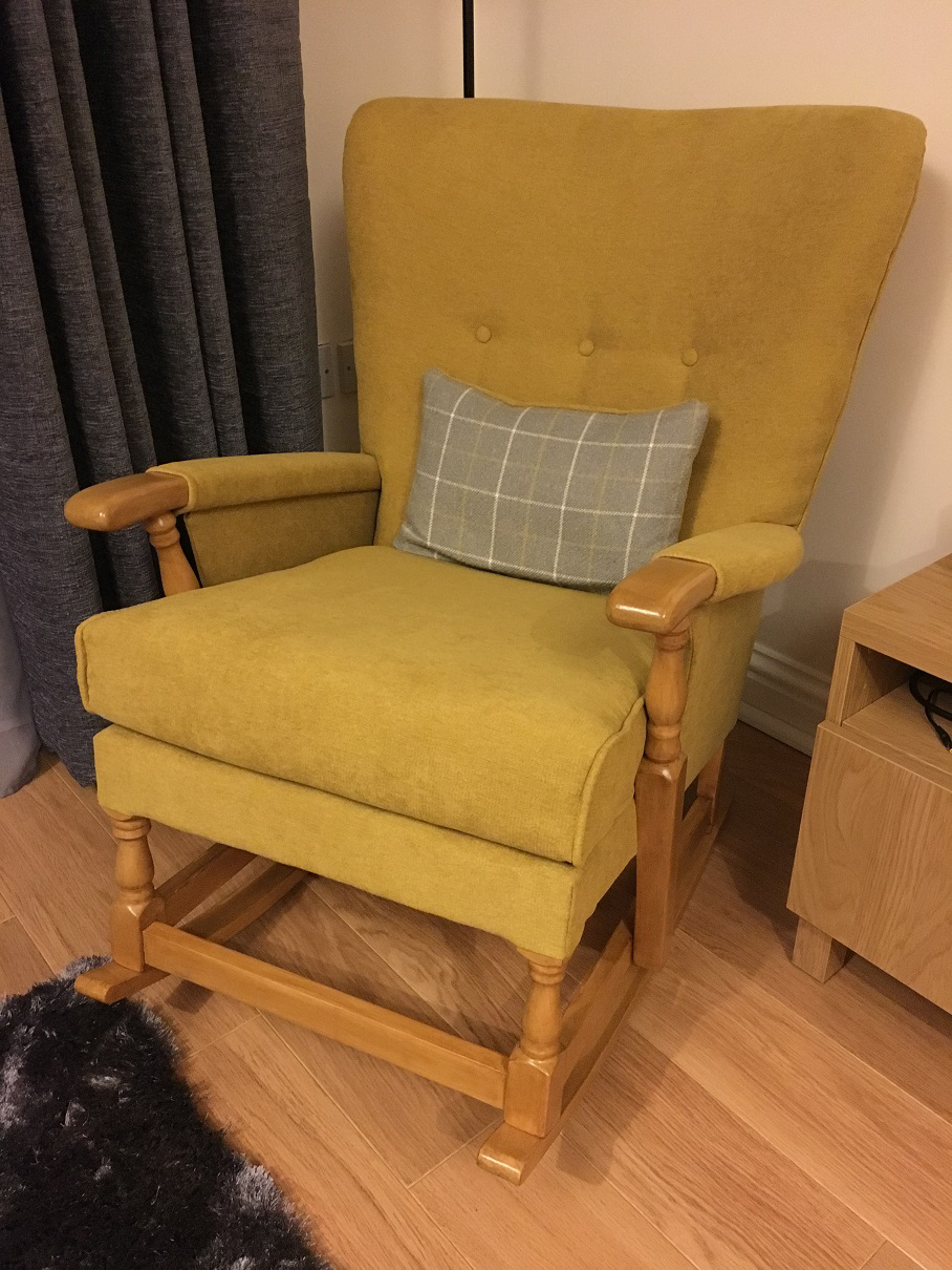 Ali upholstered her chair from floral to a more subtle plain chenille yellow fabric. Rachel Fabric Yellow | View