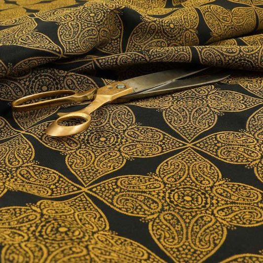 Come and view Yorkshire Fabric Shop's gold medallion fabric that features an intricate, circular motifs highlighted by a shimmering gold finish. Ideal for elegant upholstery, chairs, or curtains, it adds a luxurious and timeless charm to your creative projects.