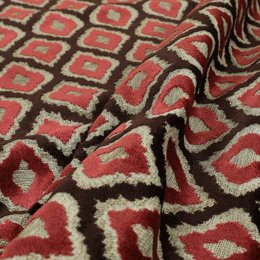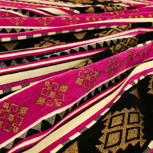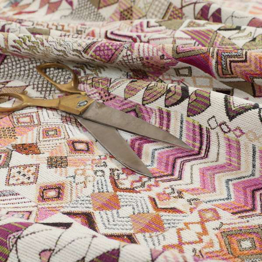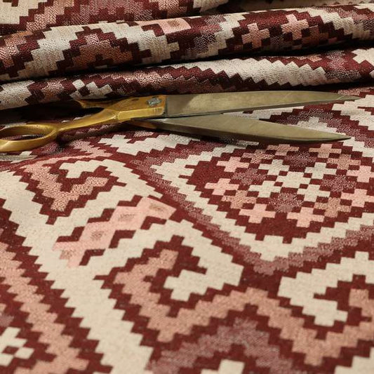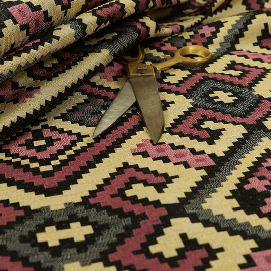Pink coloured tribal kilim pattern fabrics, perfect for upholstery and curtains. This unique fabric will bring a pop of colour and a sense of cultural richness to any room in your home available from Yorkshire Fabric Shop.