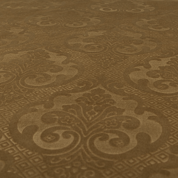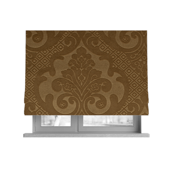 Transform your living space with Agra Roman blinds made from luxurious velveteen fabric with an embossed damask pattern. Enjoy the opulent feel and elegant design, providing both privacy and light control. Elevate your décor with these gold curtains, perfect for adding a touch of sophistication to any room.