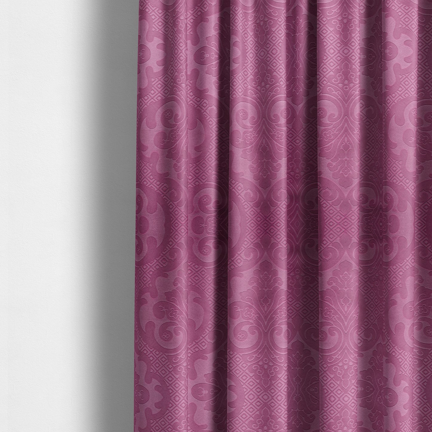 Experience luxurious style with our Agra velvet curtains. Made to measure with a pink velvet fabric and embossed damask pattern, they bring a touch of elegance to any room. Perfect for adding texture and softness to your space, these curtains will enhance your home decor.
