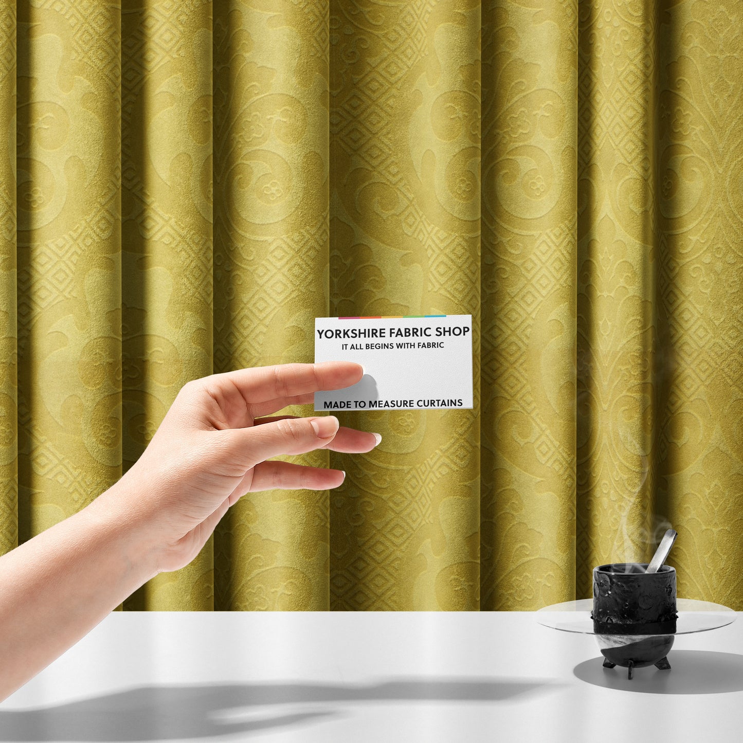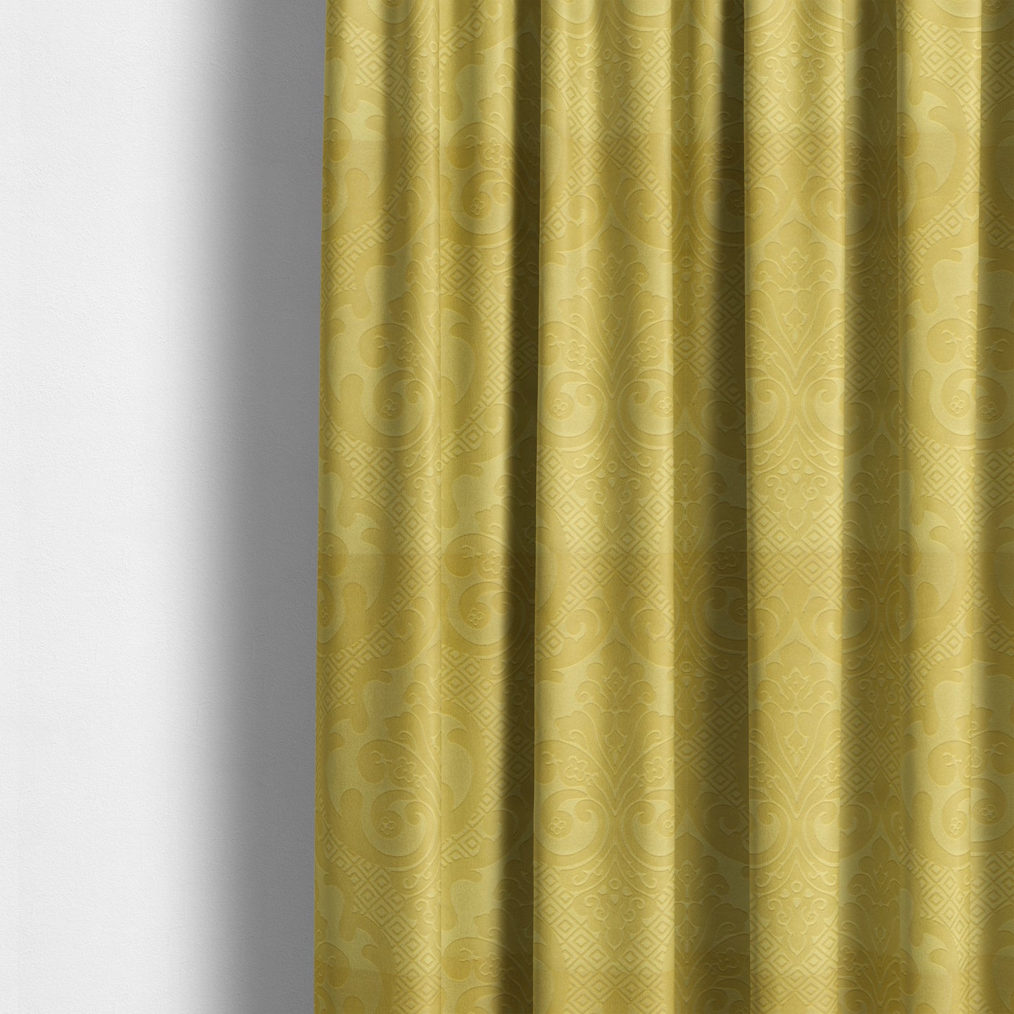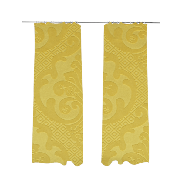 Experience luxury with our Agra velveteen embossed damask pattern upholstery curtains fabric in yellow velvet ctr-2780. Made to measure curtains provide a perfect fit for any room, while the velveteen material adds a touch of elegance. The embossed damask pattern adds texture and depth to your décor.