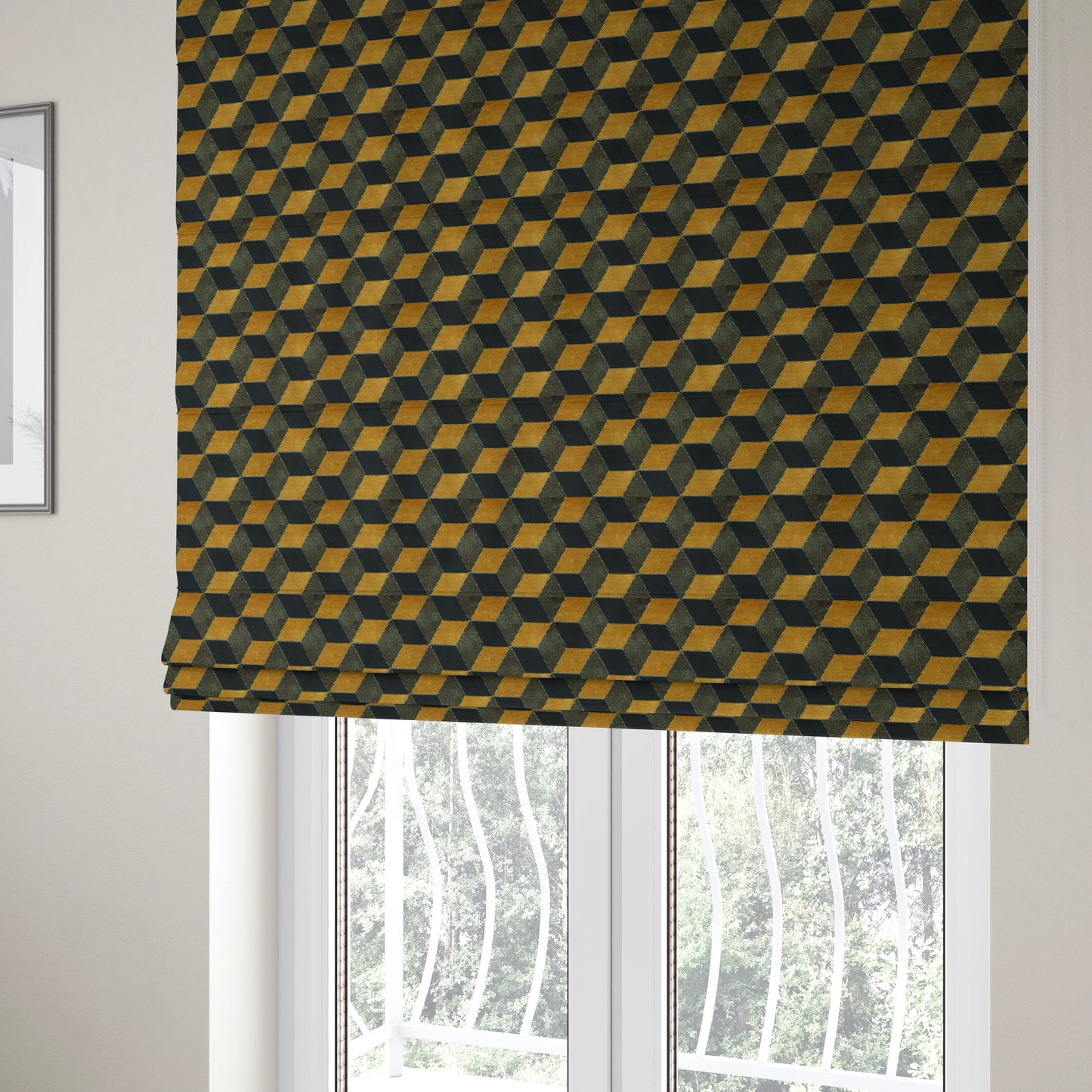Introducing our Akita geometric 3D pattern velvet fabric in a stunning golden yellow and blue colour. These Roman blinds are not only visually captivating, but also provide a functional solution for controlling sunlight and maintaining privacy. Upgrade your living space with this elegant and versatile window treatment.