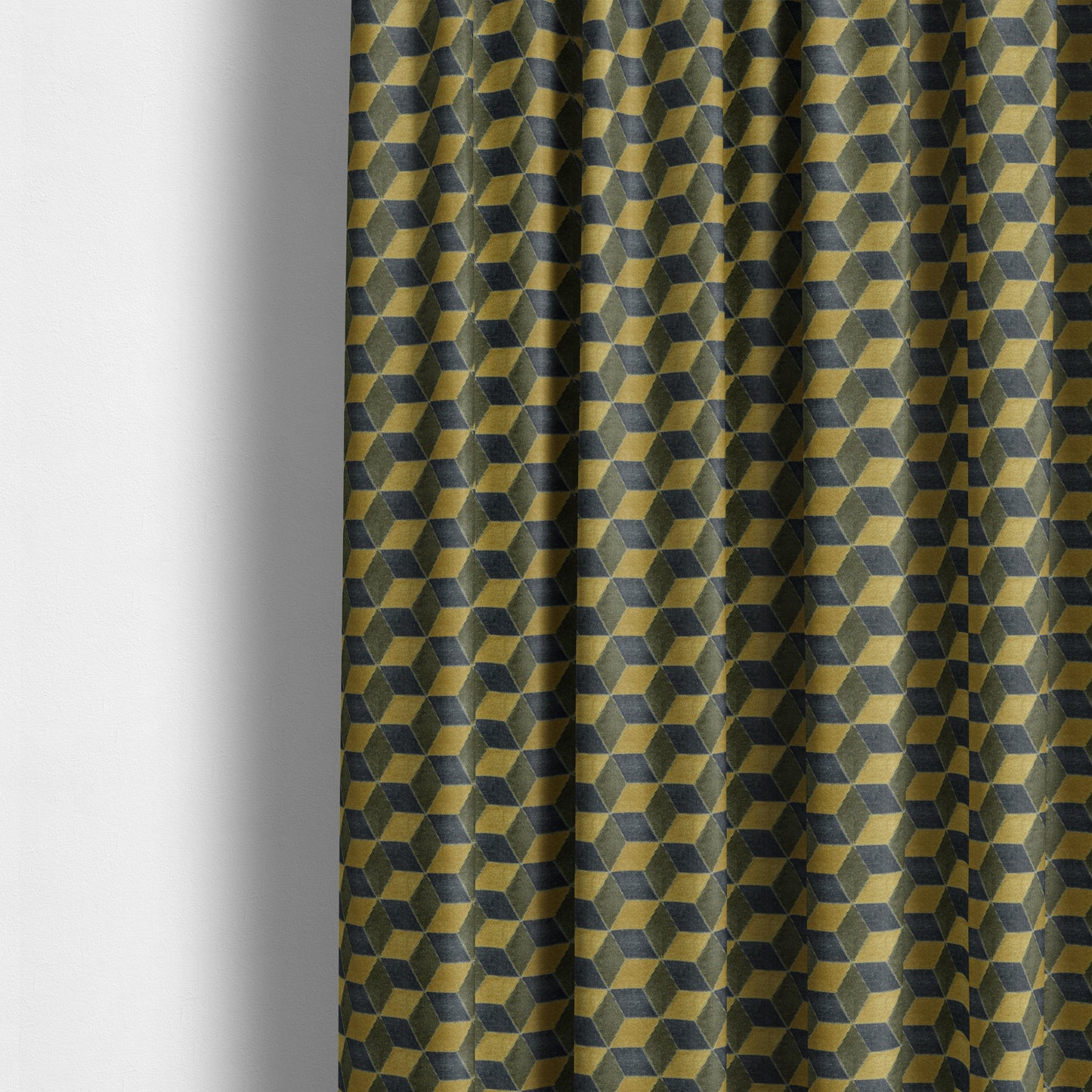 Expertly elevate your home decor with our Akita geometric 3D pattern velvet fabric. This luxurious fabric features a unique design in beautiful shades of yellow and grey, perfect for adding a touch of sophistication to any room. Made to measure curtains ensure a perfect fit for your windows.