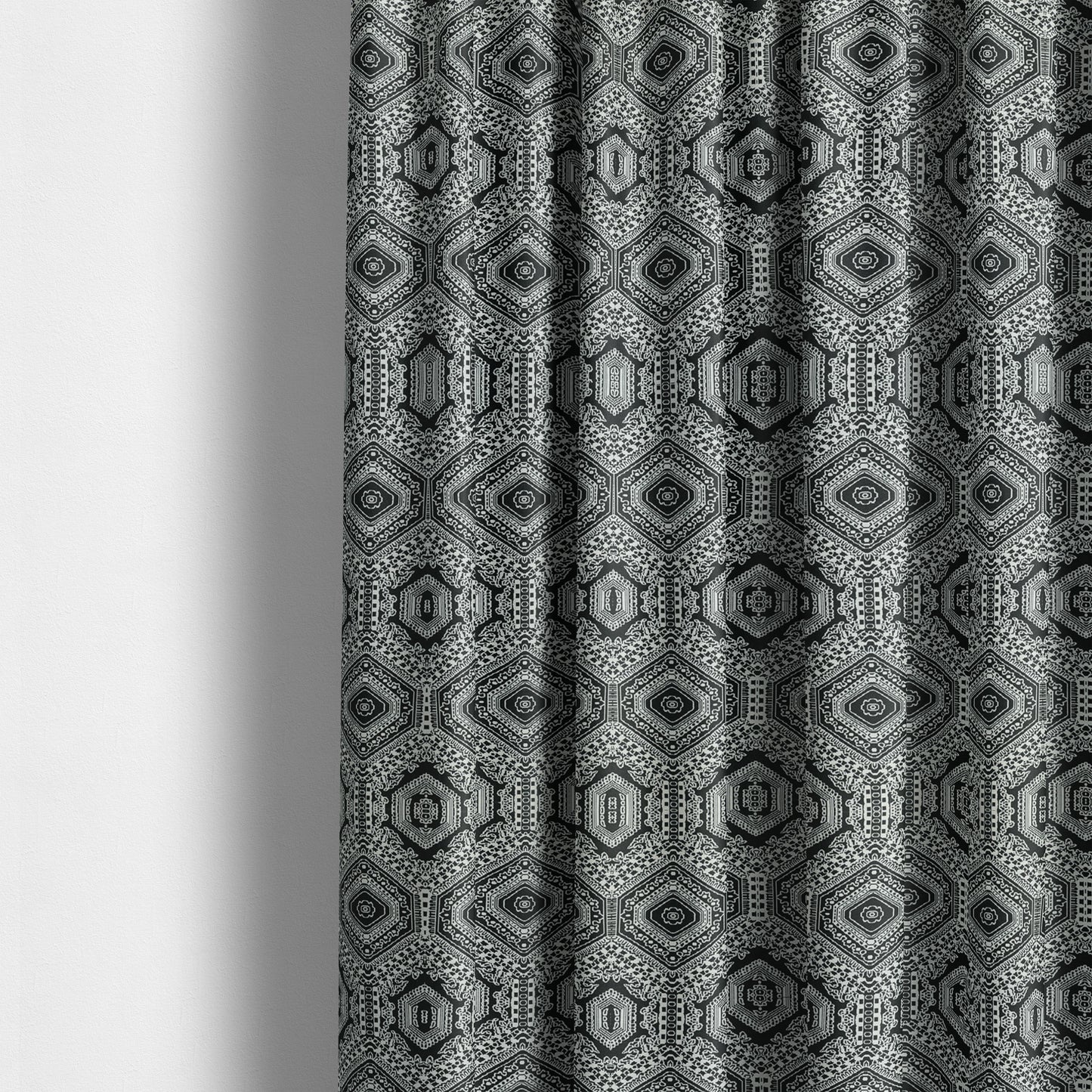 Expertly crafted with a flat weave chenille fabric, Althea's bold medallion kilim pattern in black and white adds a touch of sophistication to any room. Made to measure for the perfect fit, these curtains offer both style and function. Elevate your space with Althea.