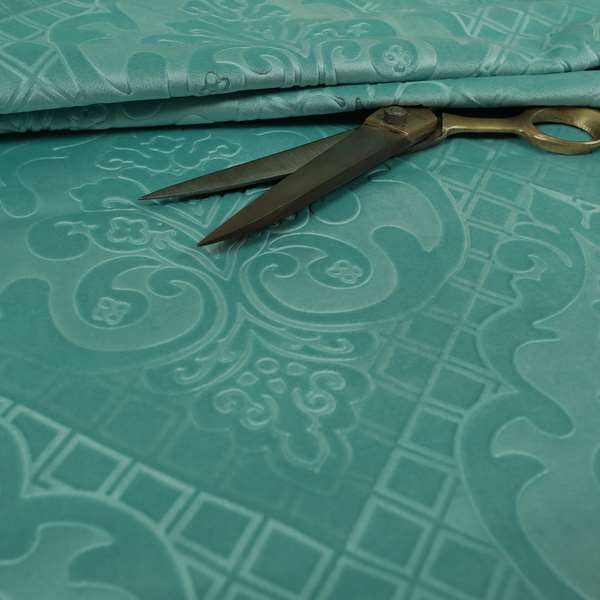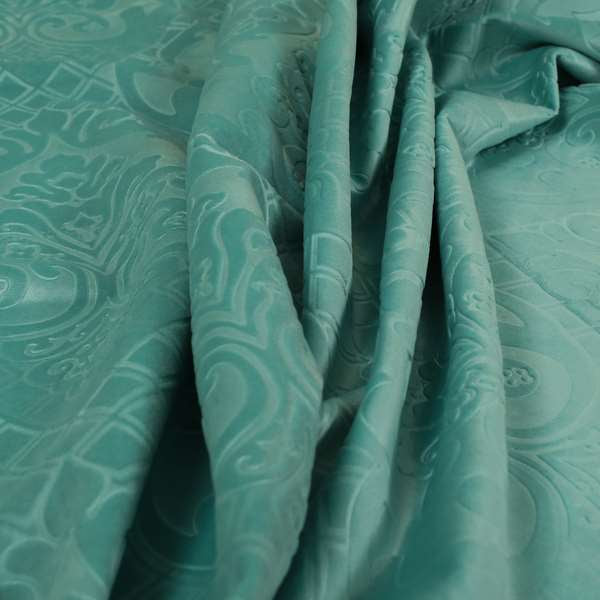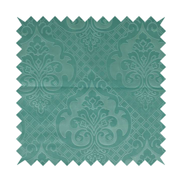 Introducing our Alvaro velveteen embossed damask pattern upholstery curtains fabric in aqua blue, perfect for adding a touch of elegance and sophistication to any room. This luxurious fabric features a beautiful embossed damask pattern and is ideal for creating stunning Roman blinds. Elevate your interior design with our high-quality, British-made fabric.