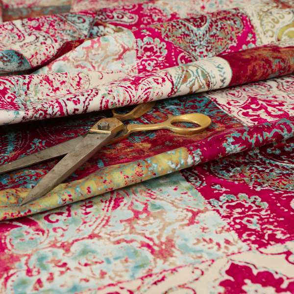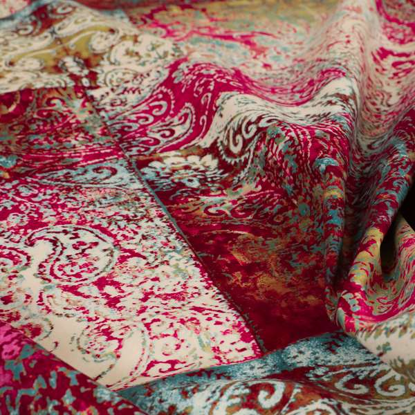 Expertly crafted with a mix of patchwork patterns, this Amalfi printed velvet fabric is perfect for adding a pop of colour to your Roman blinds. The soft and luxurious texture is both stylish and durable, making it ideal for upholstery projects. Available in a beautiful pink and burgundy red colour scheme.