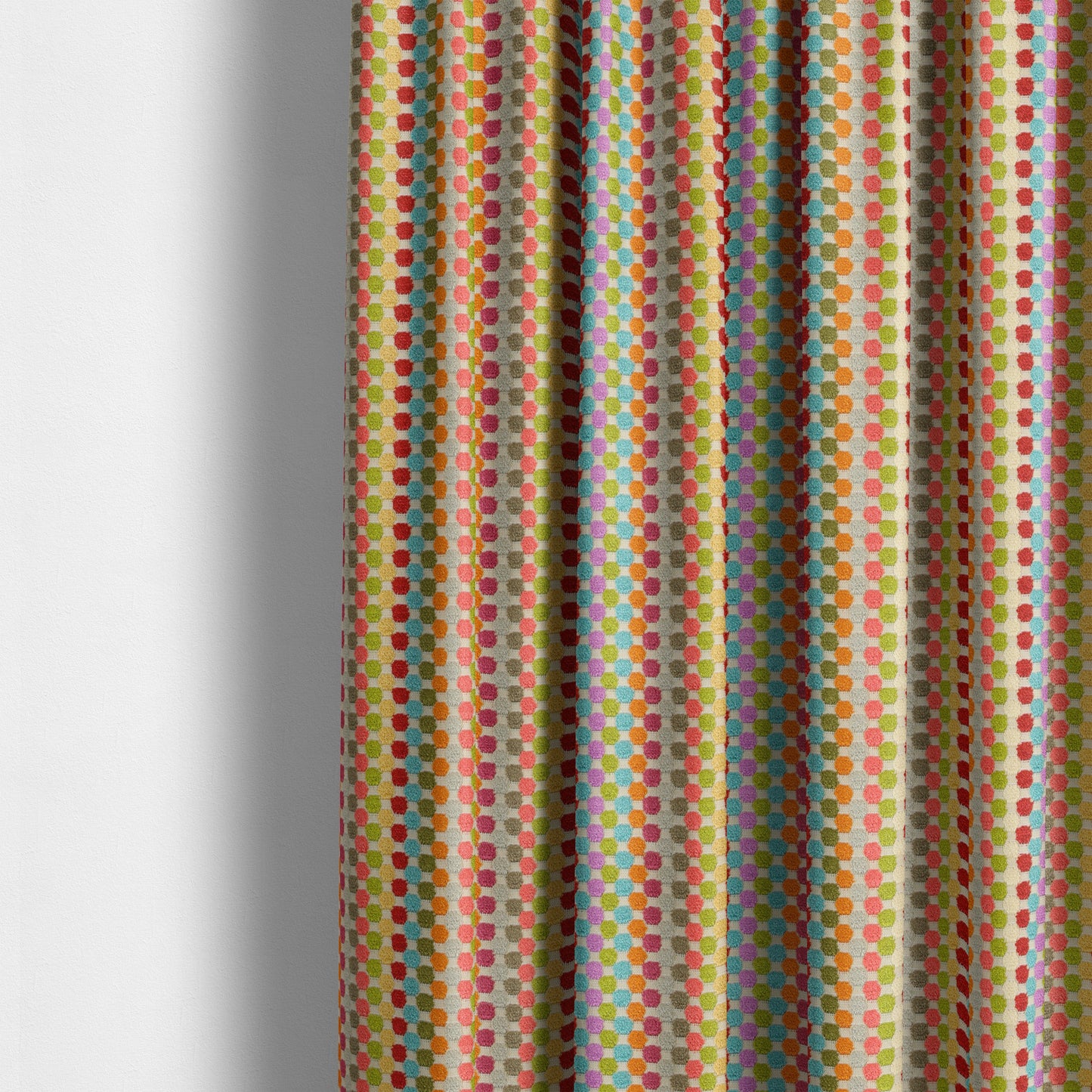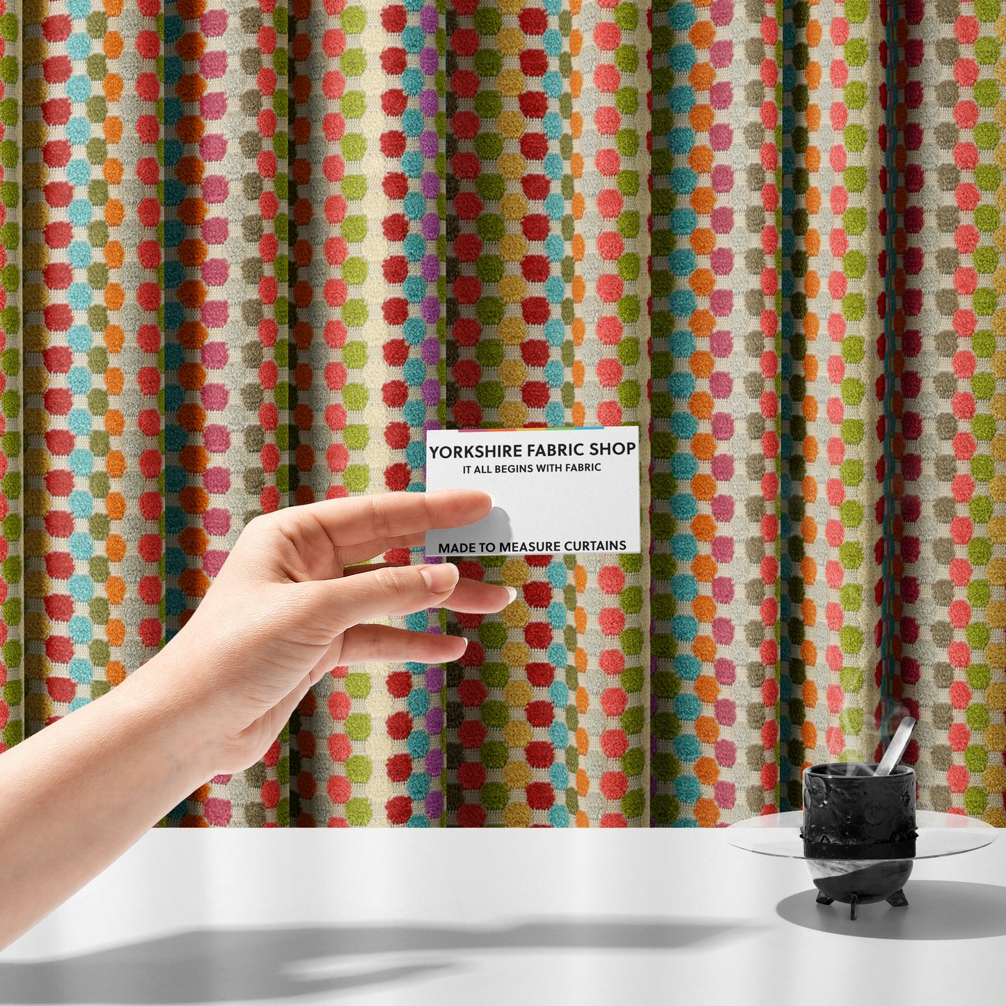 The Amazilia velvet collection features a multi-coloured polka dot pattern in soft velvet upholstery fabric. Experience luxurious comfort and add a touch of personality to your home decor with this fabric. Custom-made curtains are also available for a perfect fit.