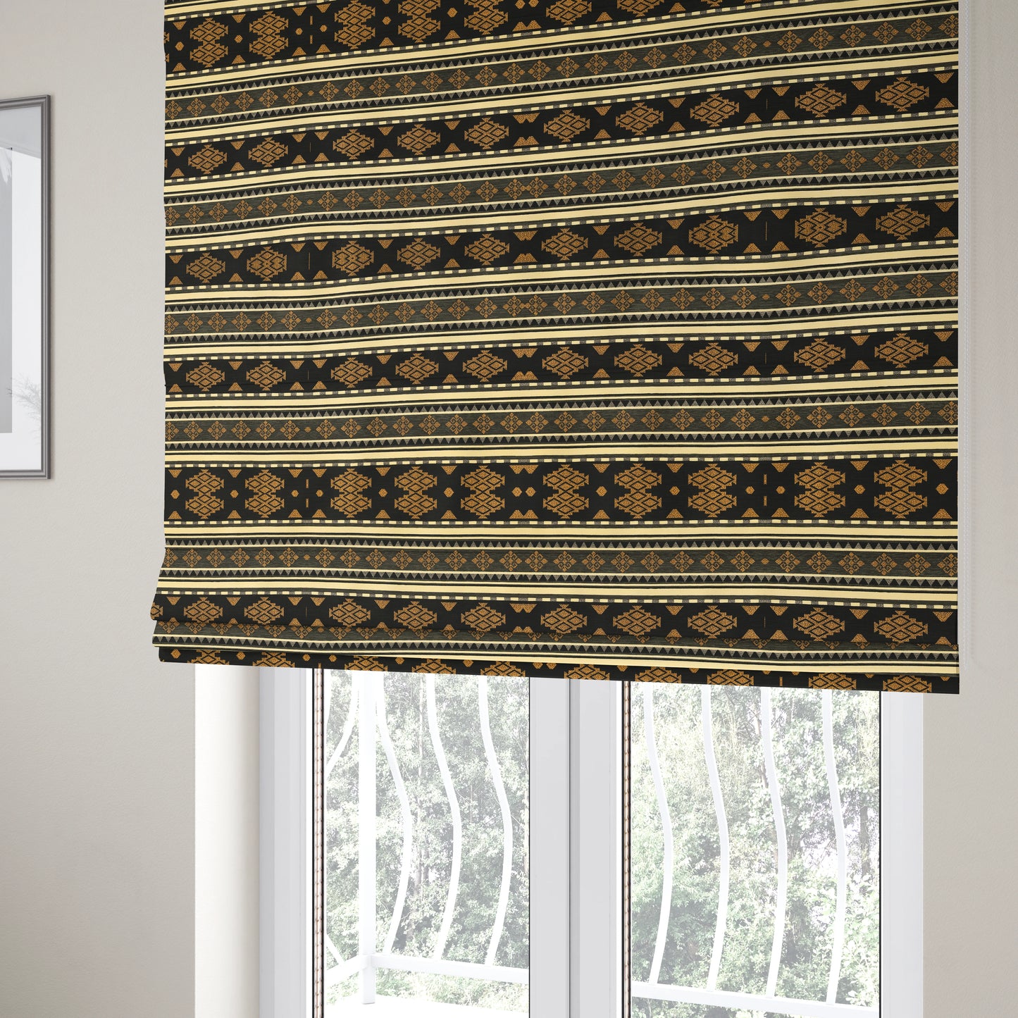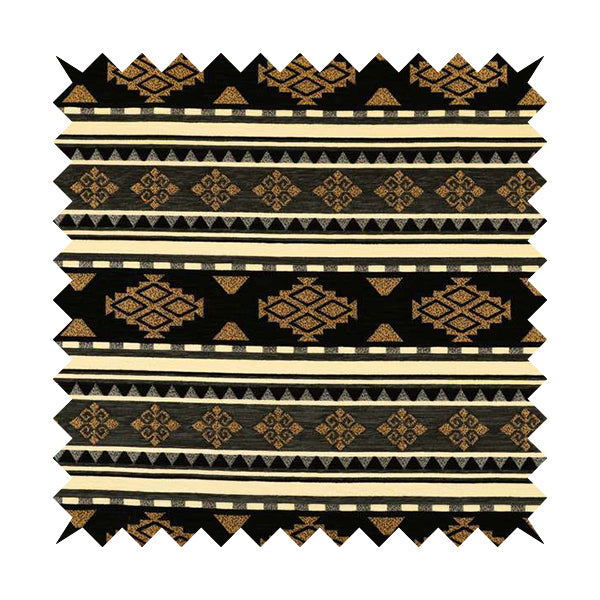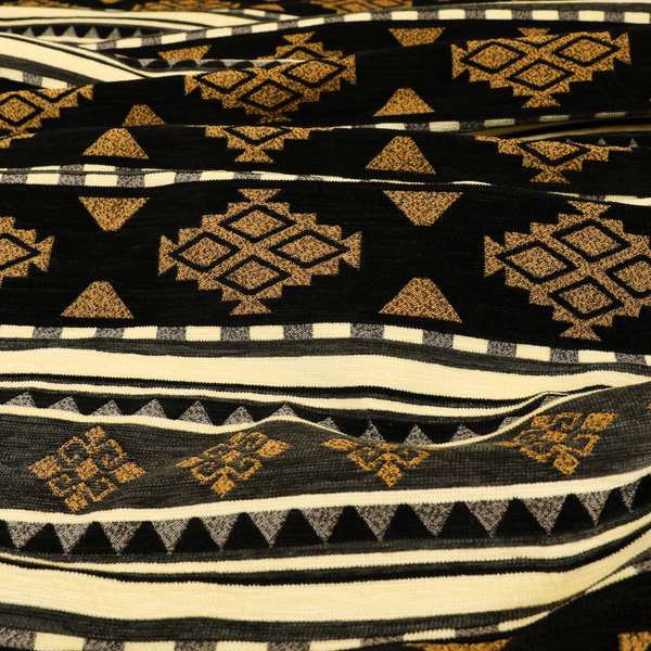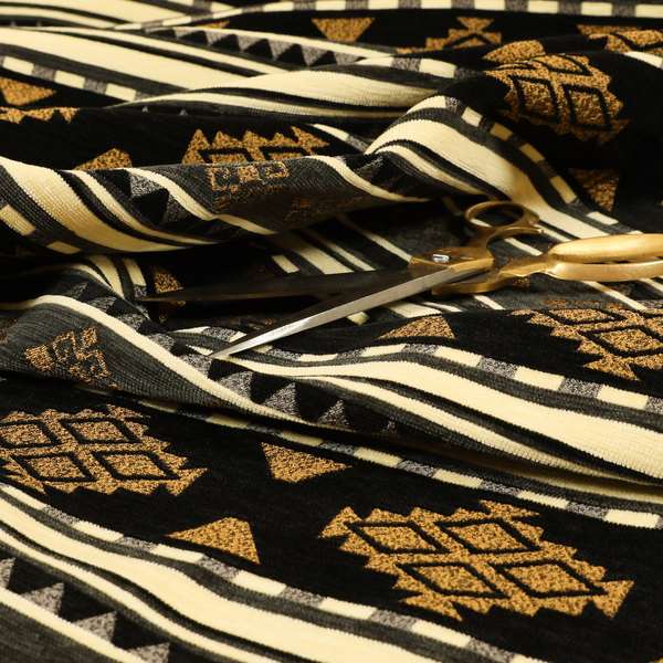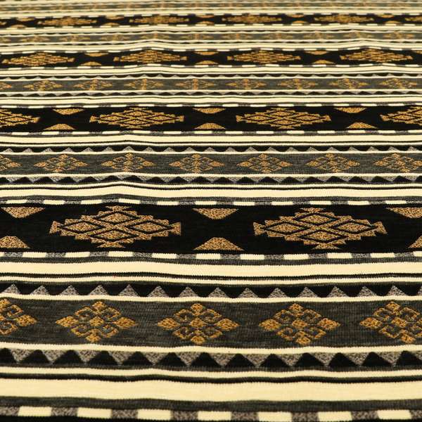 Introduce a touch of sophistication with this Anthropology kilim pattern fabric in grey, black, and gold. Perfect for upholstery and furnishing, the fabric exudes timeless elegance and lends a touch of luxury to any space. Crafted with intricate detailing and durable material, it's a versatile choice for any design project.