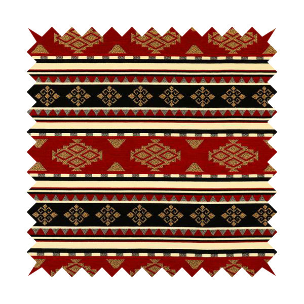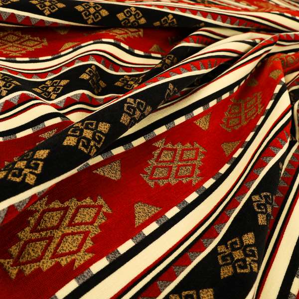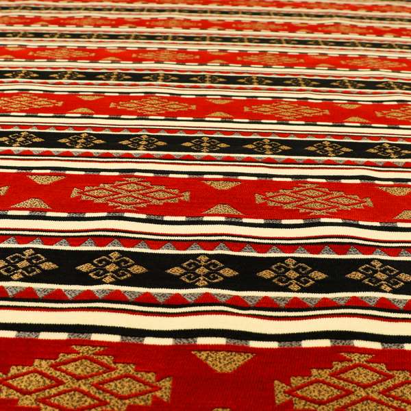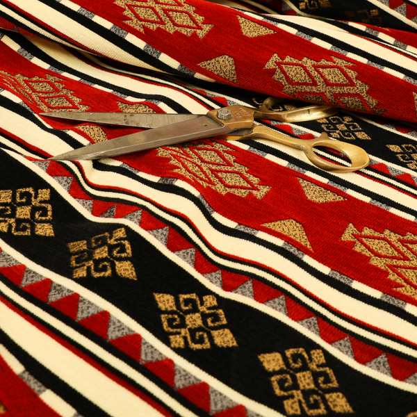 Elevate your home decor with our Anthropology kilim pattern fabric. Featuring a striking red, black, and gold colour scheme, this fabric adds a pop of colour to any room. Perfect for upholstery and furnishing, it also works well for creating unique Roman blinds. Add a touch of style with this patterned fabric.