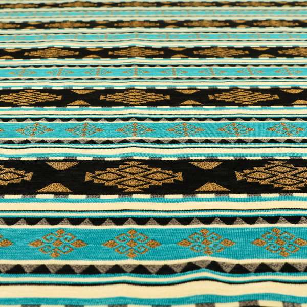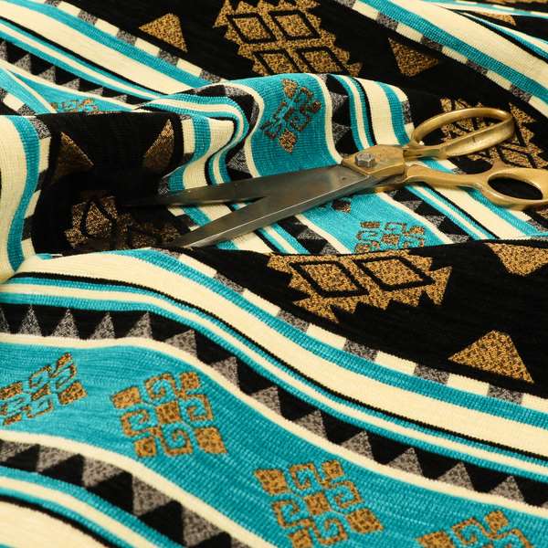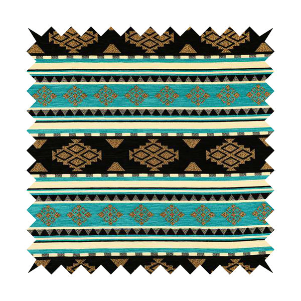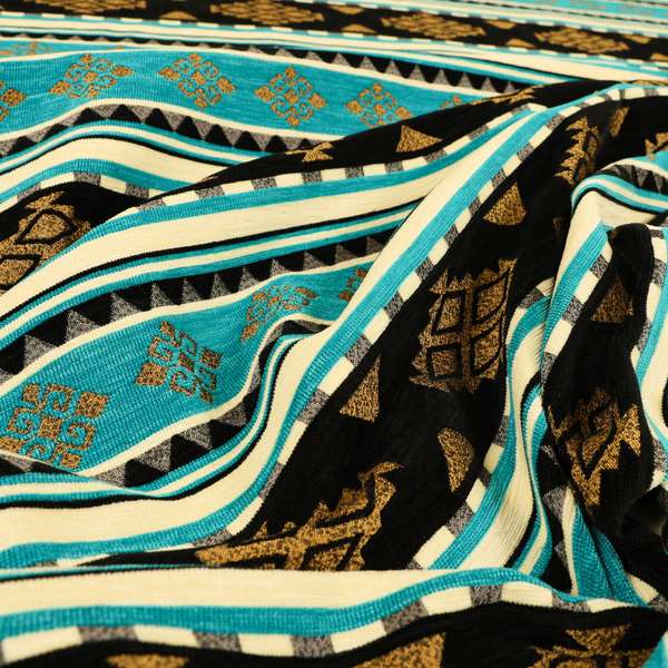 Crafted with expertise and precision, this anthropology kilim pattern fabric is designed with a blend of teal blue, black, and gold colours. Its versatility allows it to be used for both upholstery and furnishing purposes. Perfect for creating elegant and unique Roman blinds.