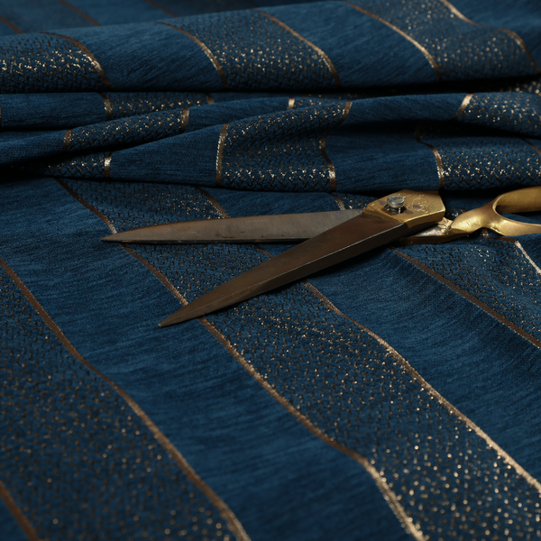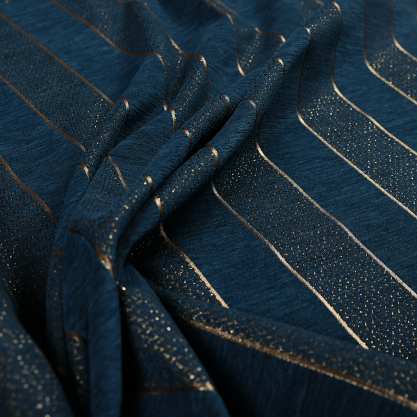 Introduce a touch of sophistication to your home with Ayon's striped furnishing fabric, featuring a beautiful blue and gold colour scheme with a subtle shine. Elevate your interior design with this luxurious and versatile addition.