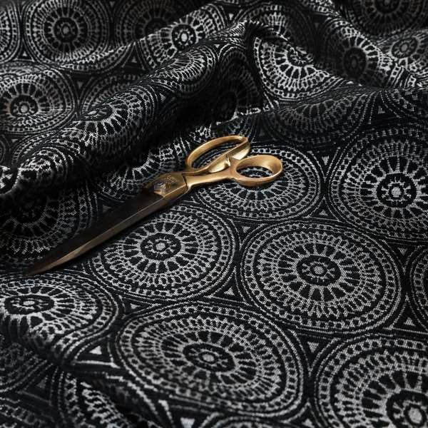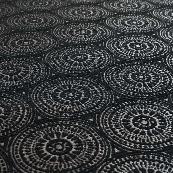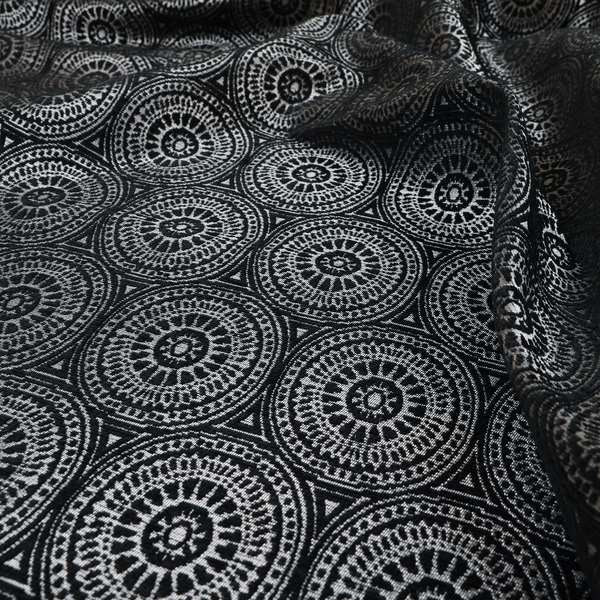 This Azima modern planet round pattern black silver shine upholstery fabric creates a sleek and contemporary look for your home. The stunning round pattern adds texture and depth to your space while the silver shine adds a touch of elegance. Perfect for Roman blinds.