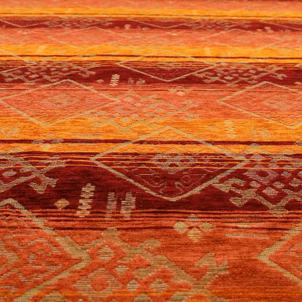 Upgrade your interior with our Bengal kilim aztec pattern collection. Made from soft chenille fabric, this upholstery adds a touch of elegance to any room. Its warm orange and burgundy colours create a cozy atmosphere, perfect for Roman blinds. Bring comfort and style to your home today with this beautiful fabric.