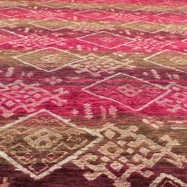 This Bengal kilim aztec pattern collection features a soft chenille fabric in a beautiful pink and purple colour combination. Its intricate kilim aztec pattern adds a touch of elegance to any room. Perfect for upholstery and Roman blinds, this high-quality fabric brings both style and durability to your home.