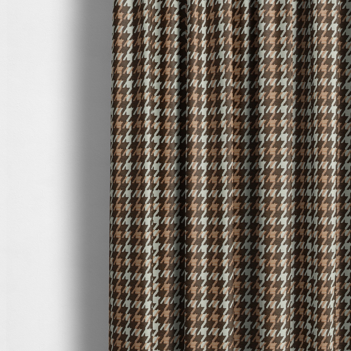 Introducing our Boxer houndstooth upholstery fabric, featuring a classic brown and orange houndstooth pattern, woven with soft chenille for a luxurious touch. Made to measure for the perfect fit, this fabric will elevate any curtains with its elegant and timeless design.