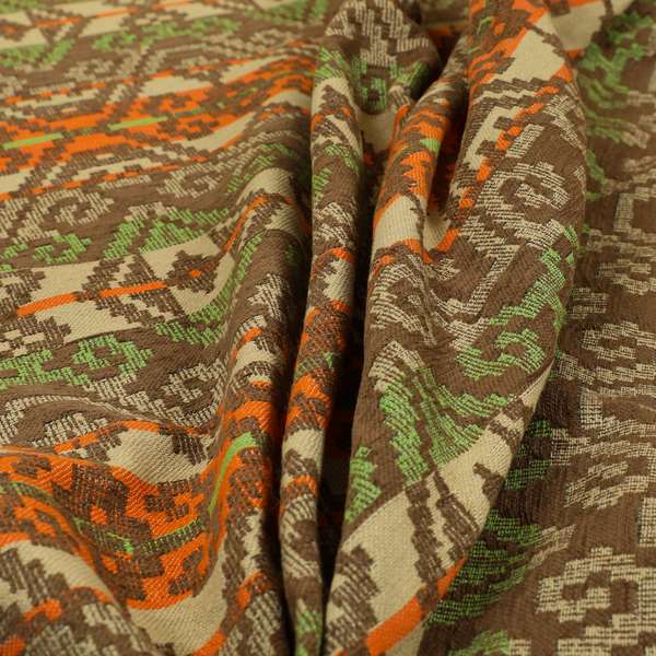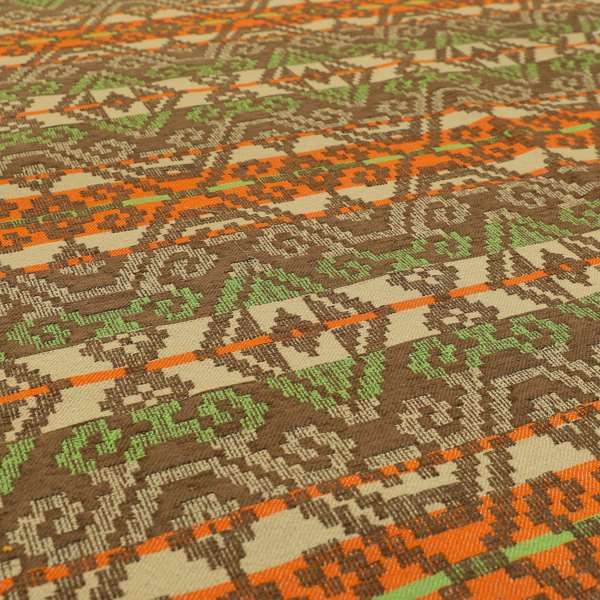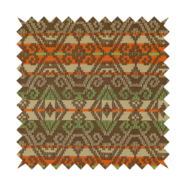 Expertly designed for a striking aesthetic, our Brown orange green colour tribal kilim pattern striped chenille furnishing fabric JO-1218 is perfect for adding an eye-catching touch to your Roman blinds. With its bold hues and unique tribal pattern, this fabric will bring warmth and character to any room.