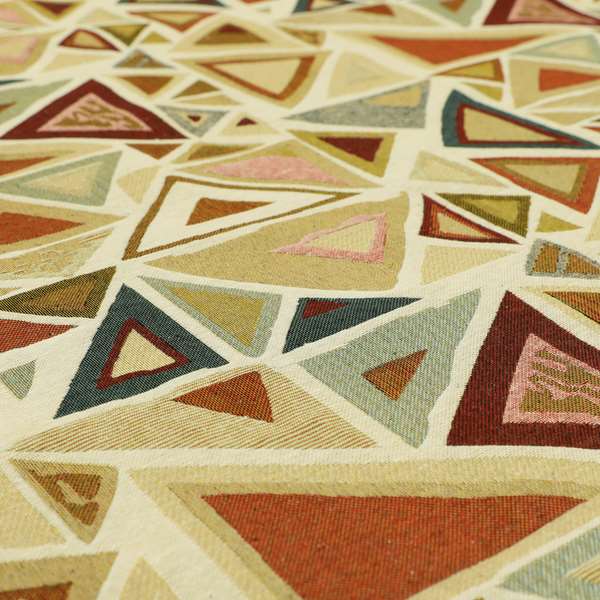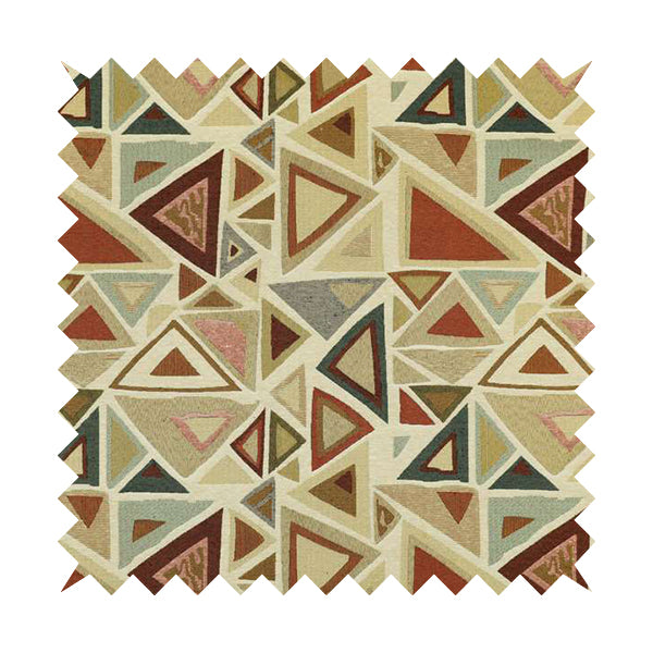This chenille upholstery fabric features a modern Bruges stripe geometric pyramid pattern in white, blue, and beige. Its durable material is perfect for Roman blinds, adding a touch of sophistication to any room. Elevate your home decor with this elegant fabric.