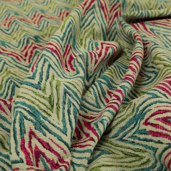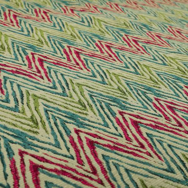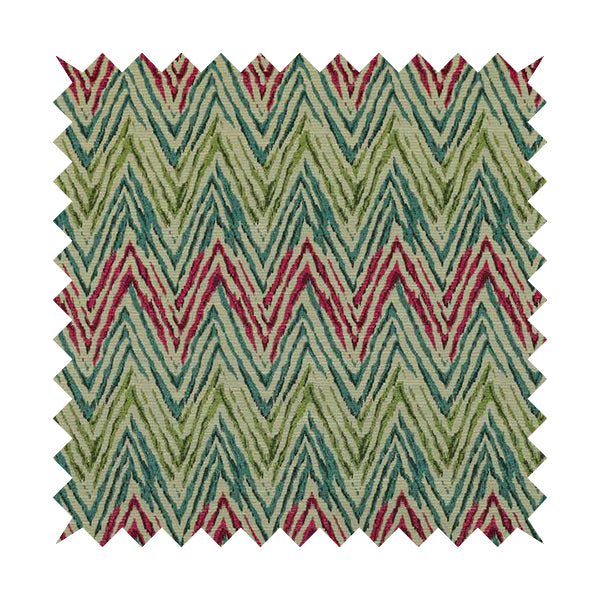 Elevate your home decor with a touch of boldness with our Chevron striped inspired pattern green pink blue coloured chenille upholstery fabric JO-1416. Made with high-quality chenille fabric, these Roman blinds add a pop of colour and pattern to any room. Perfect for a modern and chic look.