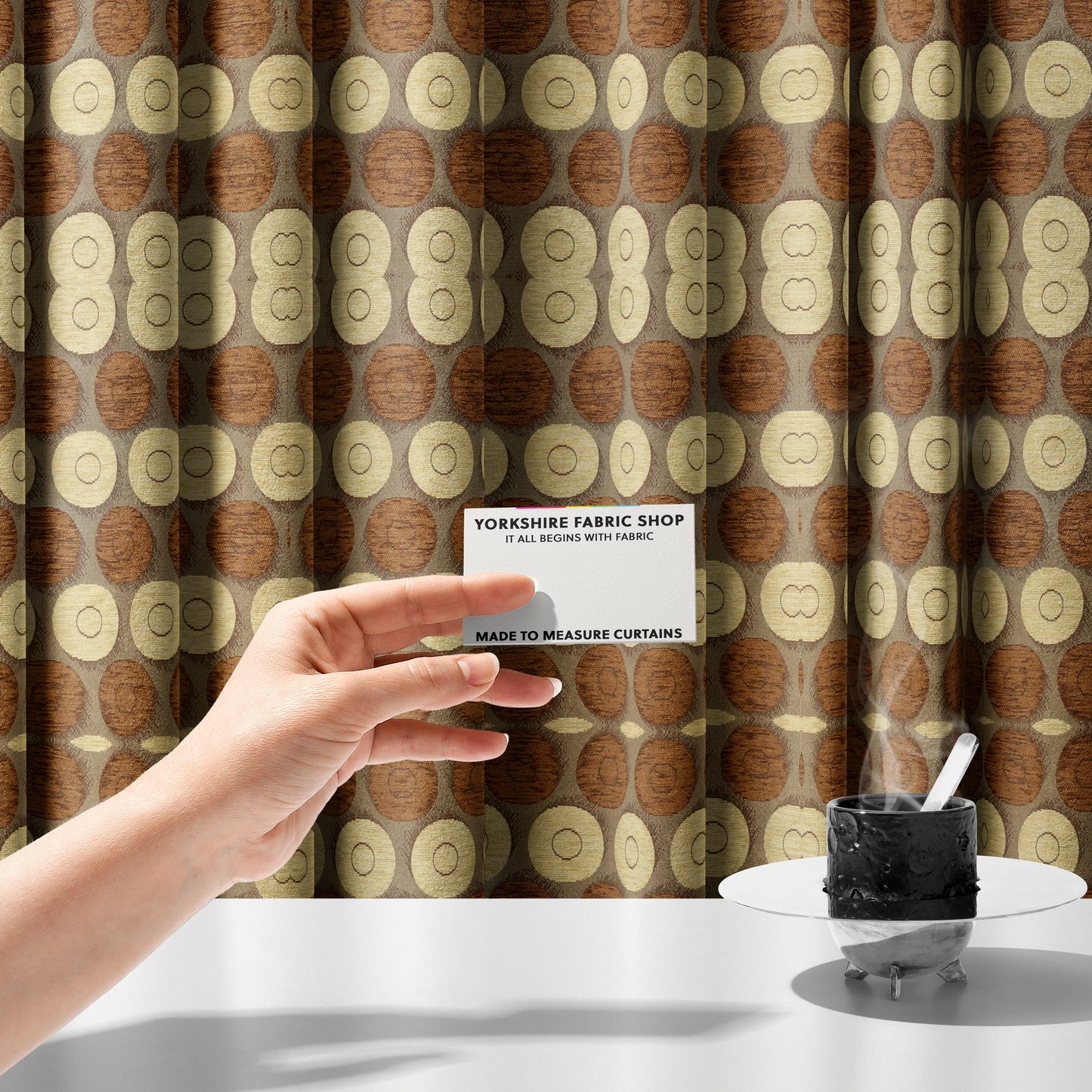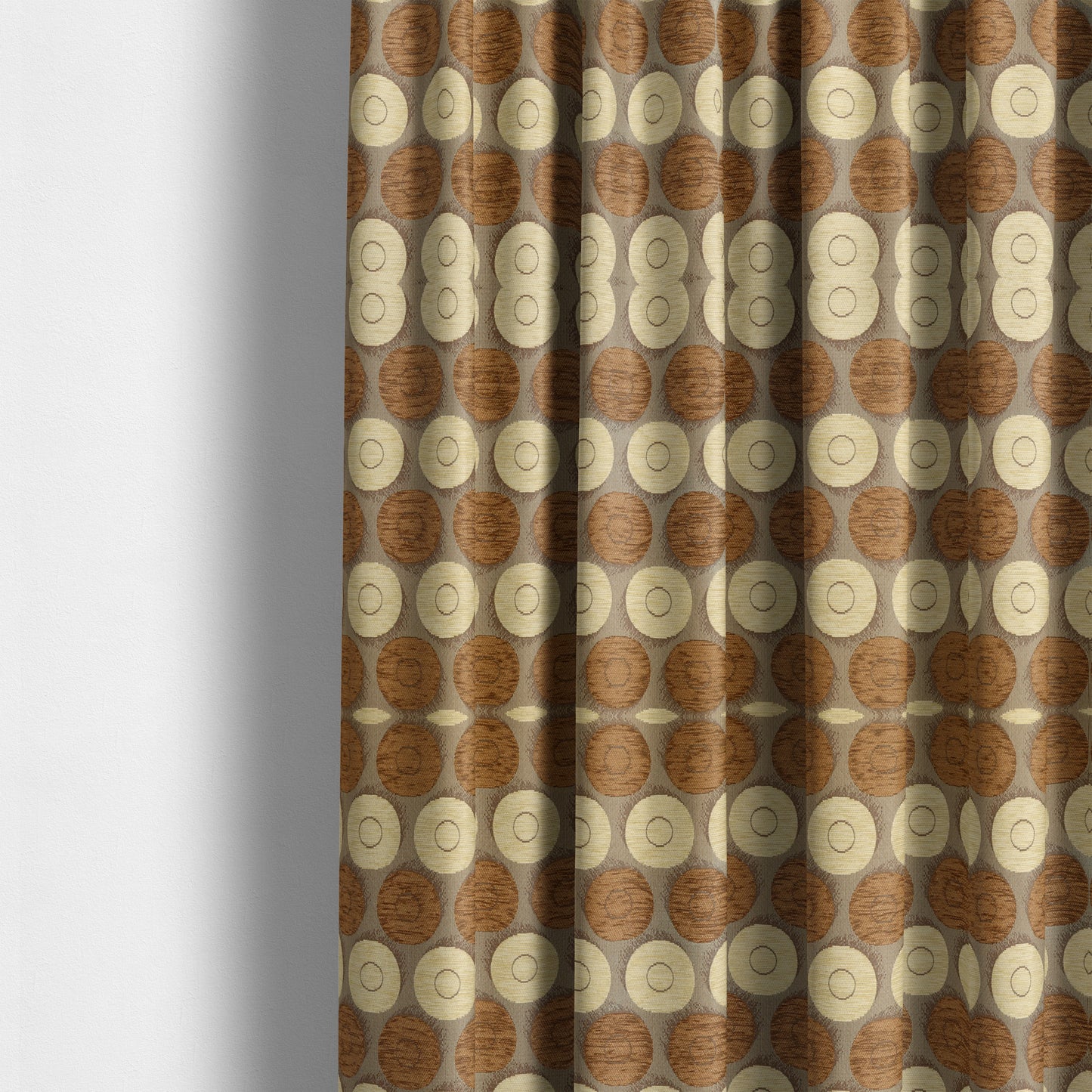 This luxurious upholstery fabric features a striking circular geometric pattern in a rich gold, beige, and brown colour scheme. Made from high-quality chenille material, it is perfect for creating custom curtains that are both stylish and durable. Elevate your home decor with this elegant and customizable fabric.
