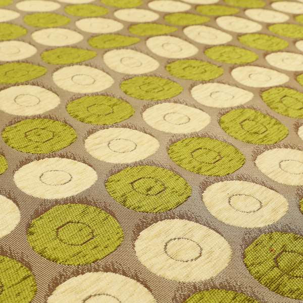 Introducing Chinaz's ctr-892 Roman blinds made from luxurious chenille upholstery fabric in a circular geometric pattern. Featuring a beautiful combination of gold, beige, and green, these blinds add a touch of elegance to any room. Enjoy both style and functionality with this top-of-the-line product.