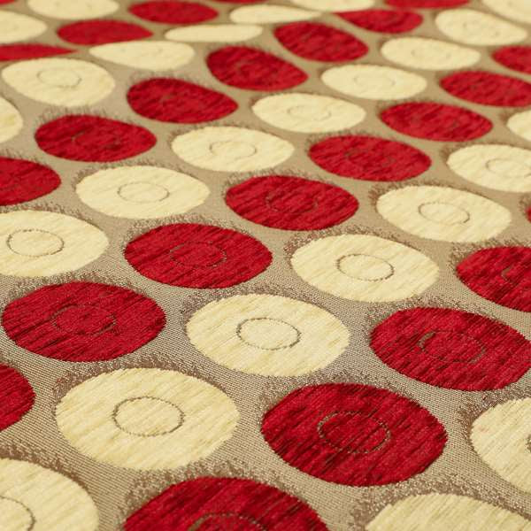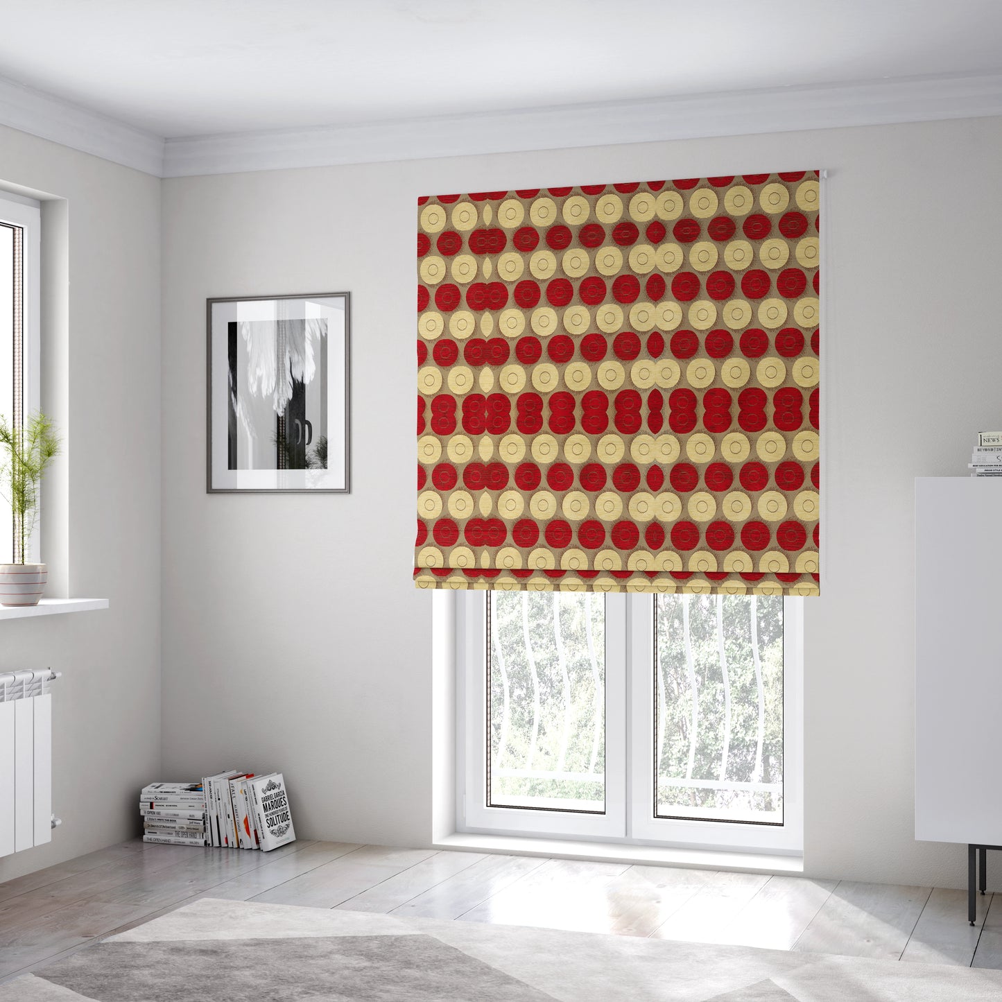 Experience luxurious comfort and elegant style with our Chinaz circular geometric fabric. The rich gold, beige, and red colour combination adds warmth and sophistication to any room. Made with premium chenille upholstery, this fabric is perfect for creating striking Roman blinds. Elevate your home decor with this versatile and timeless piece.