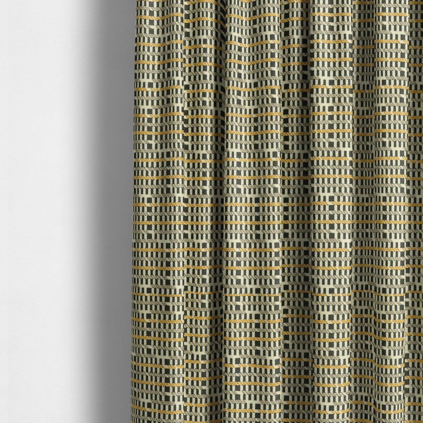 Expertly crafted and made to measure, these cream black brown and yellow striped curtains add a touch of geometric elegance to any room. Made from high-quality chenille upholstery fabric, they provide both style and durability. Elevate your home decor with these sophisticated curtains.