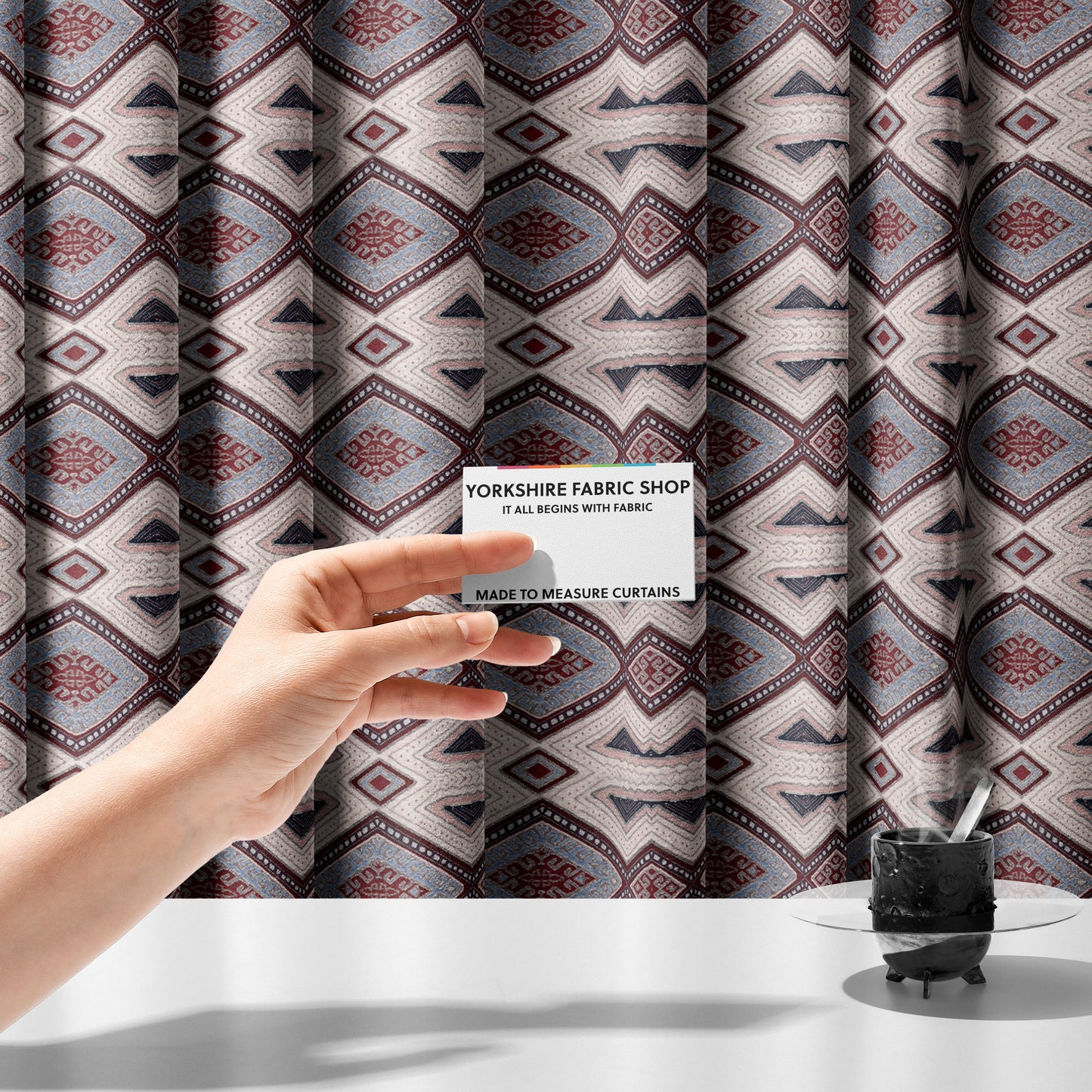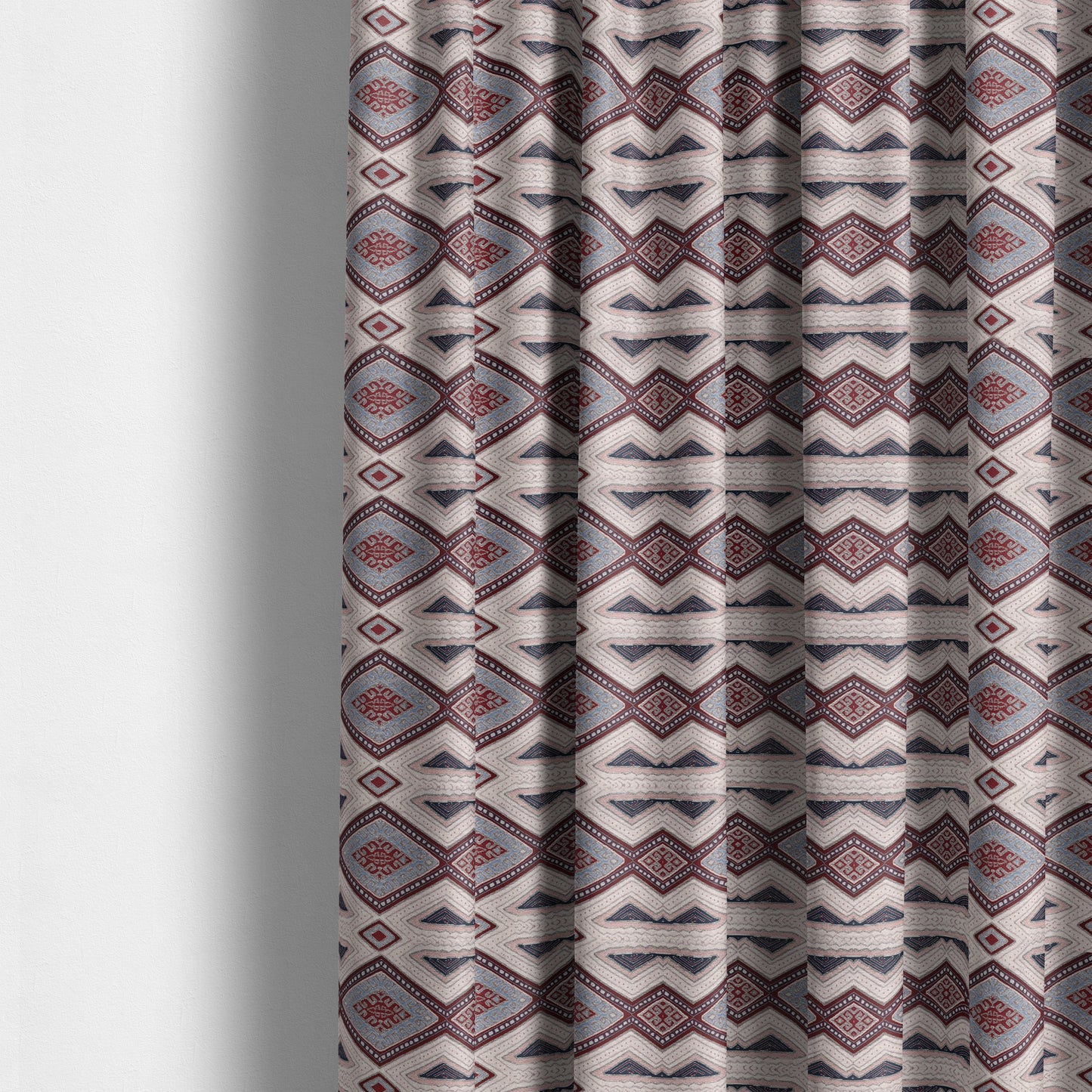 This Cream wine blue colour kilim aztec geometric design soft chenille upholstery fabric is perfect for creating made to measure curtains. The combination of bold patterns and soft material will add a touch of elegance and style to any room. Expertly crafted and customizable, these curtains are sure to elevate your home decor.