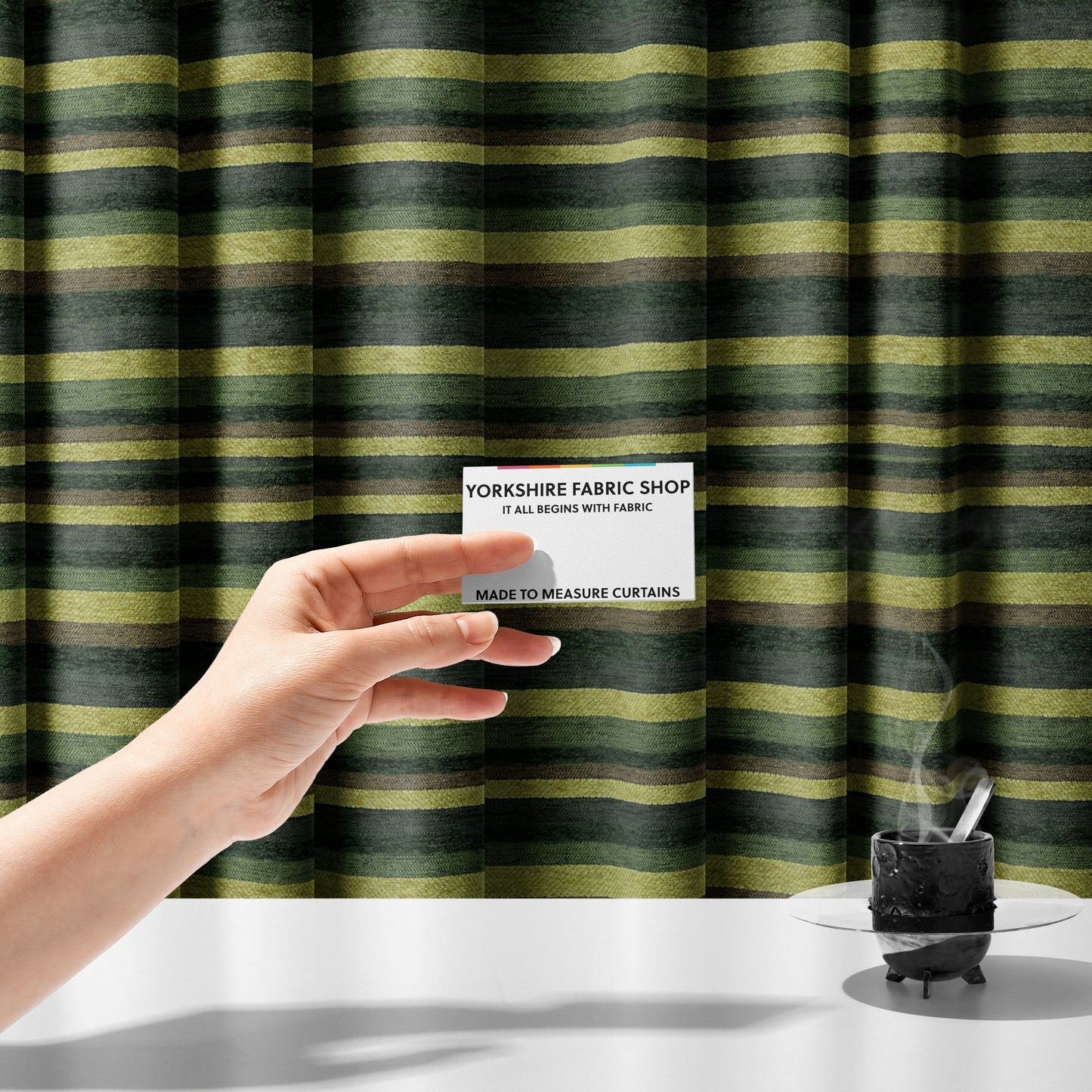 Elevate your living space with Enya designer curtains, made from soft and luxurious chenille fabric in a refreshing green striped pattern. Handcrafted and made to measure, these curtains will add a touch of elegance to any room. Enjoy the perfect combination of style and comfort with Enya.