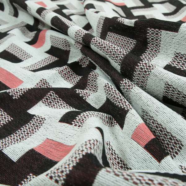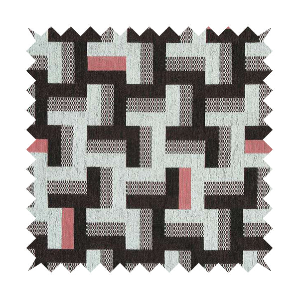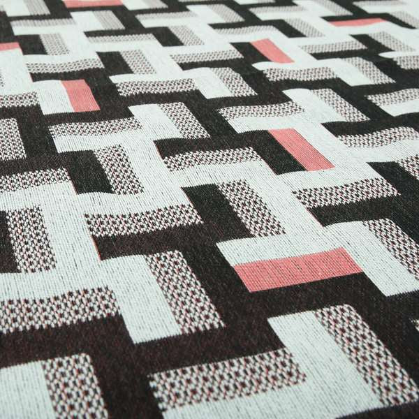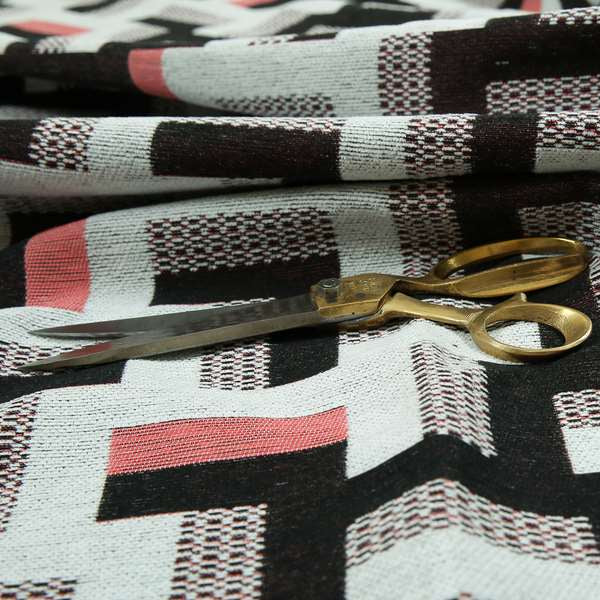 This Fantasque fabric features a black and pink geometric pattern in a soft chenille weave, perfect for stylish and modern Roman blinds. Its durable upholstery quality ensures long-lasting use. Elevate your space with this high-quality and versatile fabric.