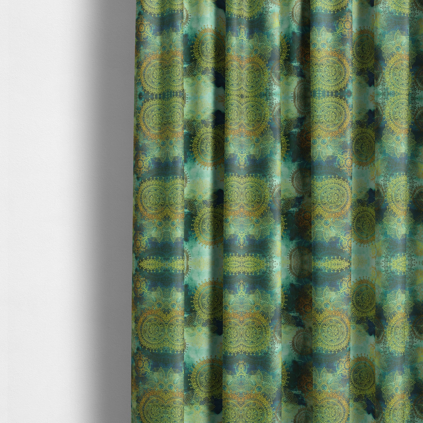 Upgrade your decor with our Freedom velvet fabric in deep blue, ocean green, and yellow. Its circular pattern adds a touch of elegance to any space. This furniture-grade upholstery fabric is perfect for creating custom curtains that will elevate your home with its luxurious look and feel. Made to measure for a perfect fit every time.