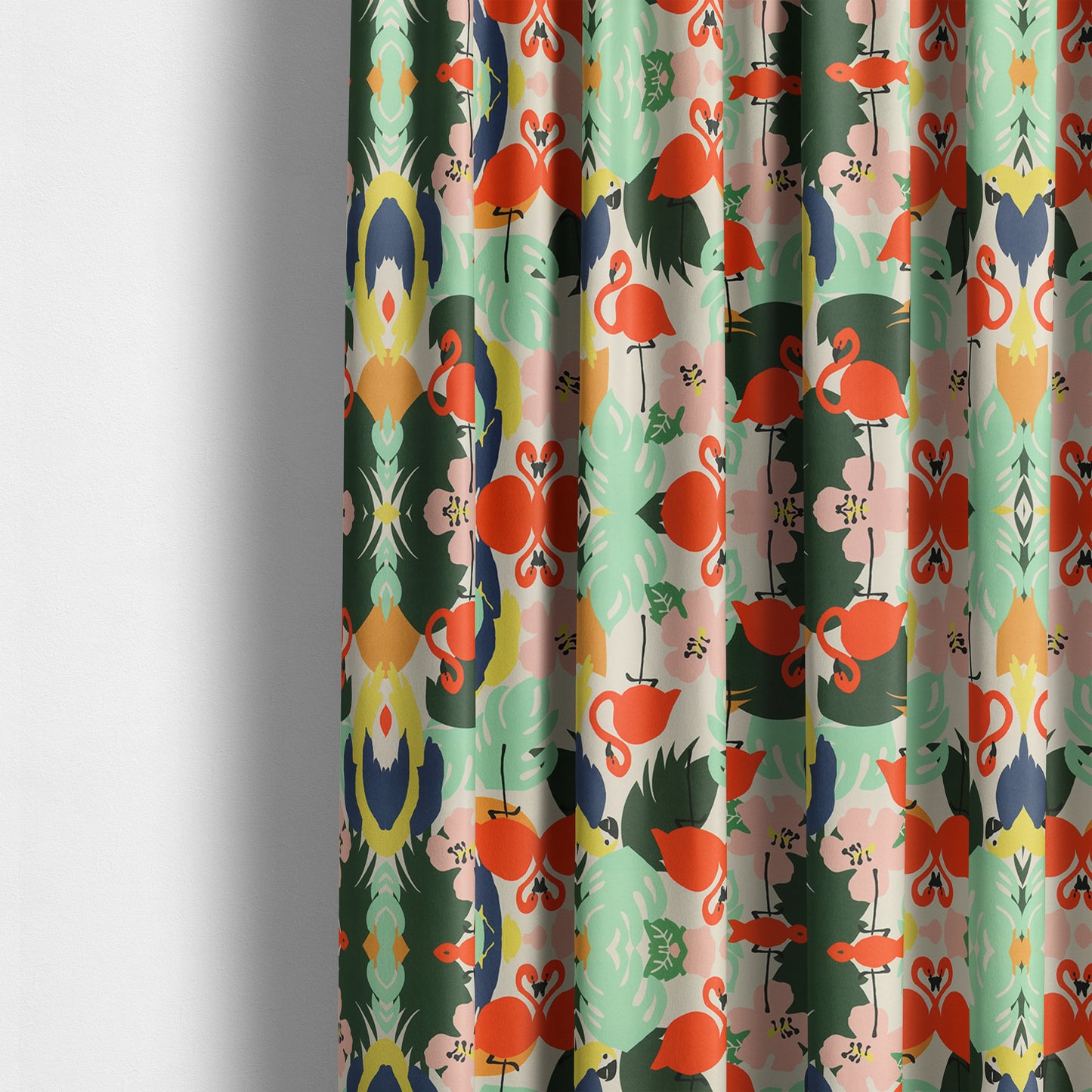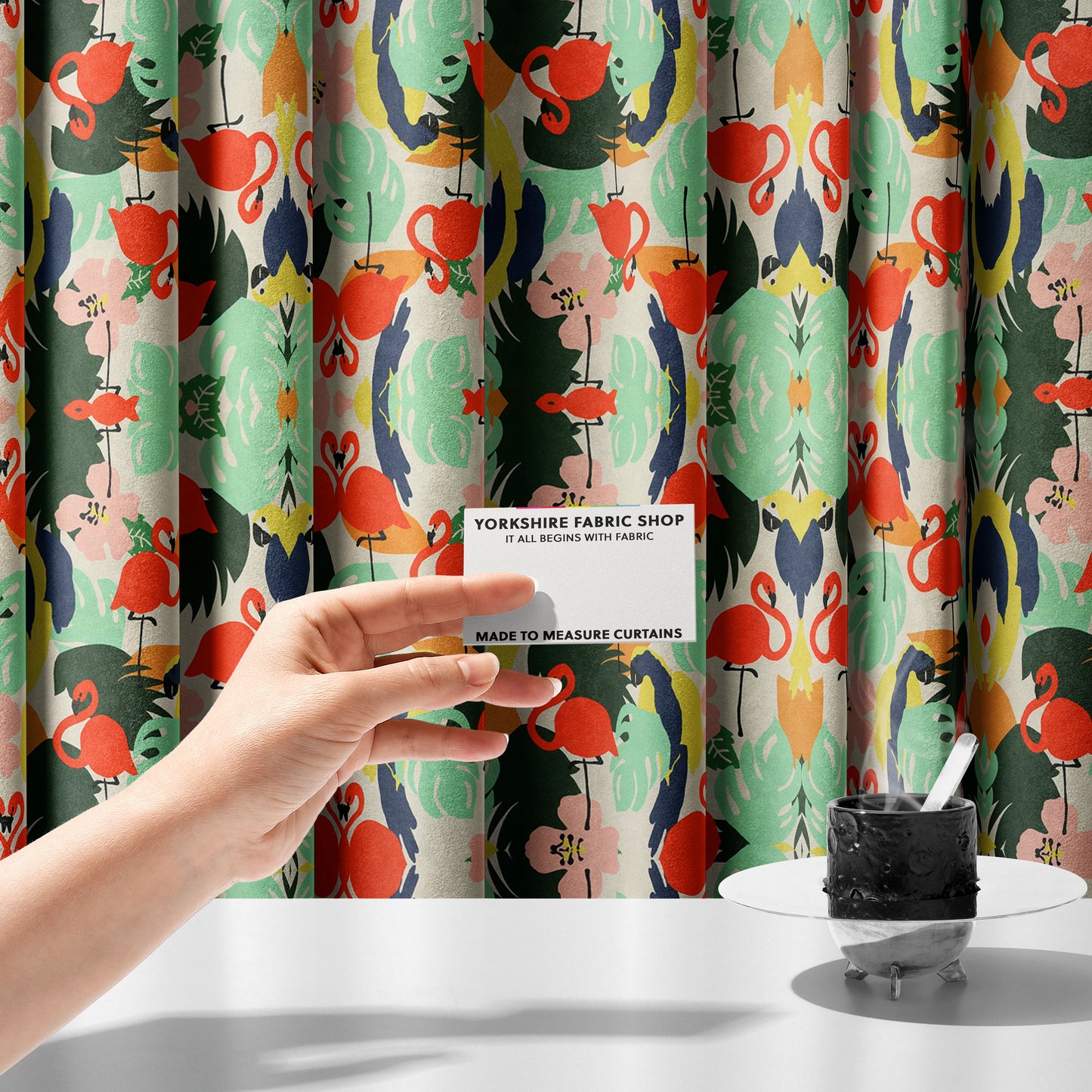 Elevate your home decor with our Freedom printed velvet fabric, featuring a striking pink flamingo and blue yellow parrot pattern. Soft and durable, this upholstery fabric is perfect for making custom curtains that add a touch of whimsy to any room. Made to measure for a perfect fit every time.