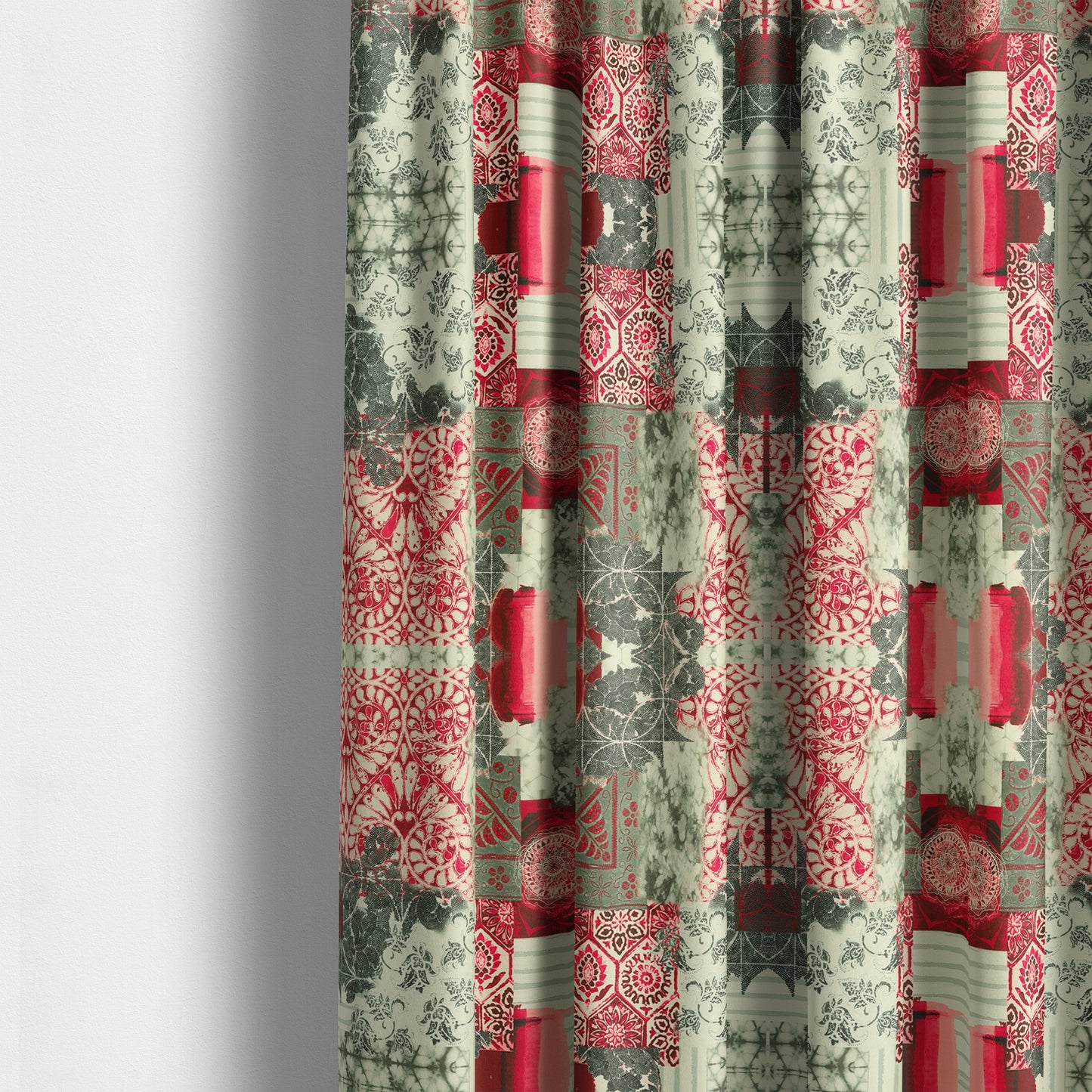 Enhance your home decor with the luxurious Freedom printed velvet fabric. The unique red and grey patchwork pattern adds a touch of sophistication and style to any space. Made to measure curtains provide the perfect fit for a flawless look. Elevate your space with this elegant upholstery fabric.