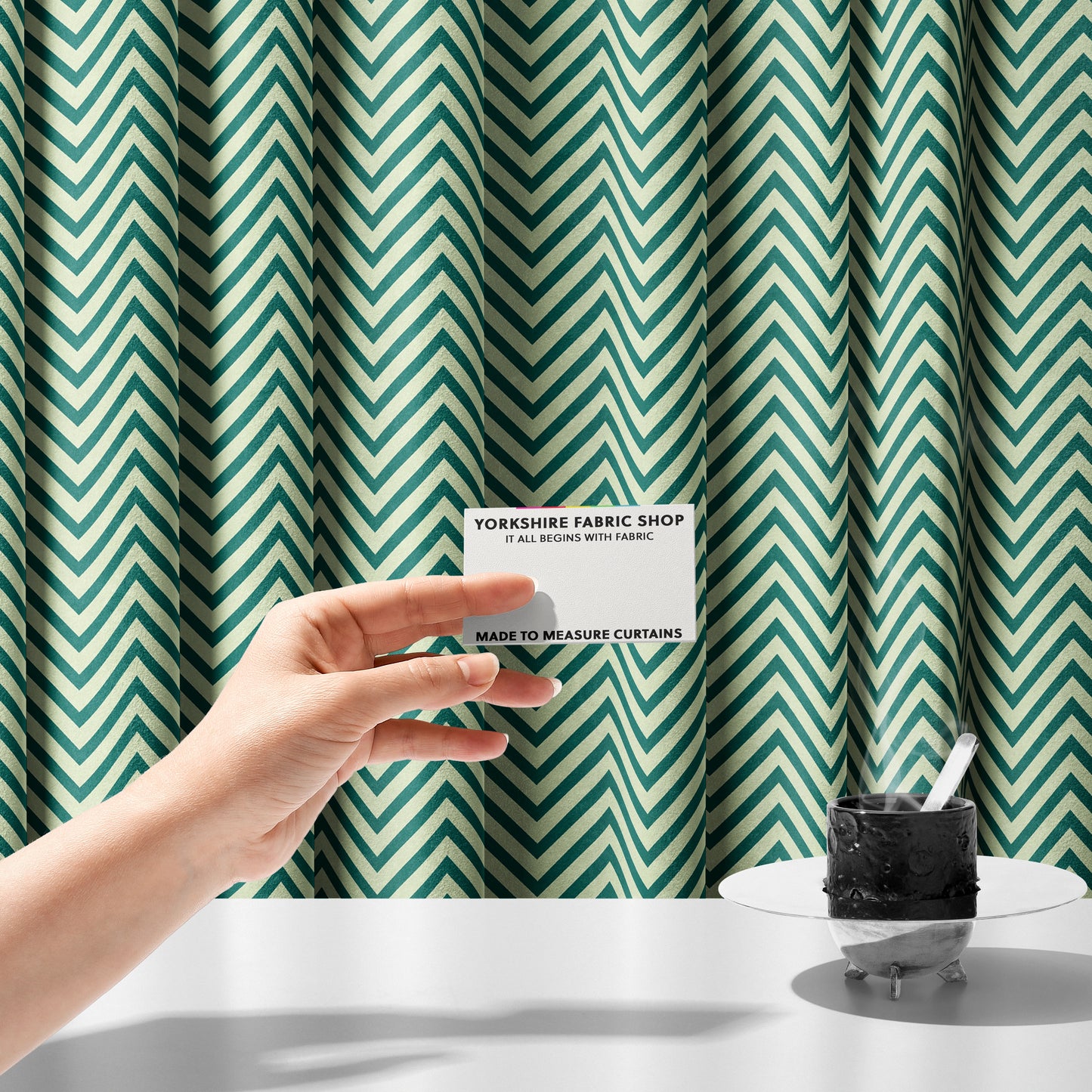 Upgrade your home decor with our Freedom printed velvet fabric curtains. Featuring a teal and white chevron stripe pattern, this upholstery fabric is perfect for adding a touch of elegance to any room. Made to measure for a perfect fit, these curtains will elevate your space with style and sophistication.