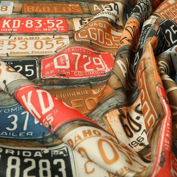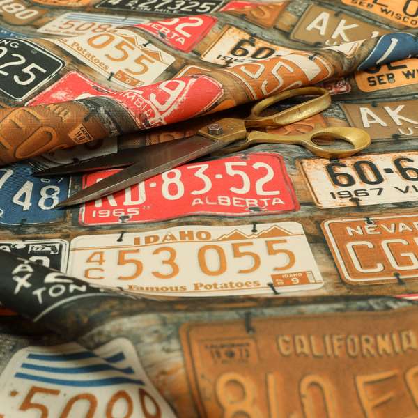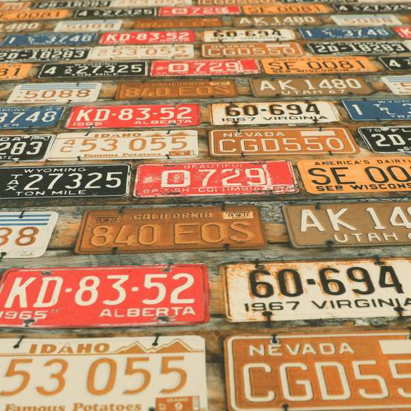 This chenille upholstery fabric features a unique rust colored print, inspired by US car license plates. Its intricate pattern will add a touch of character to any interior, while its durability makes it perfect for upholstery projects. Transform your space with these Roman blinds today.