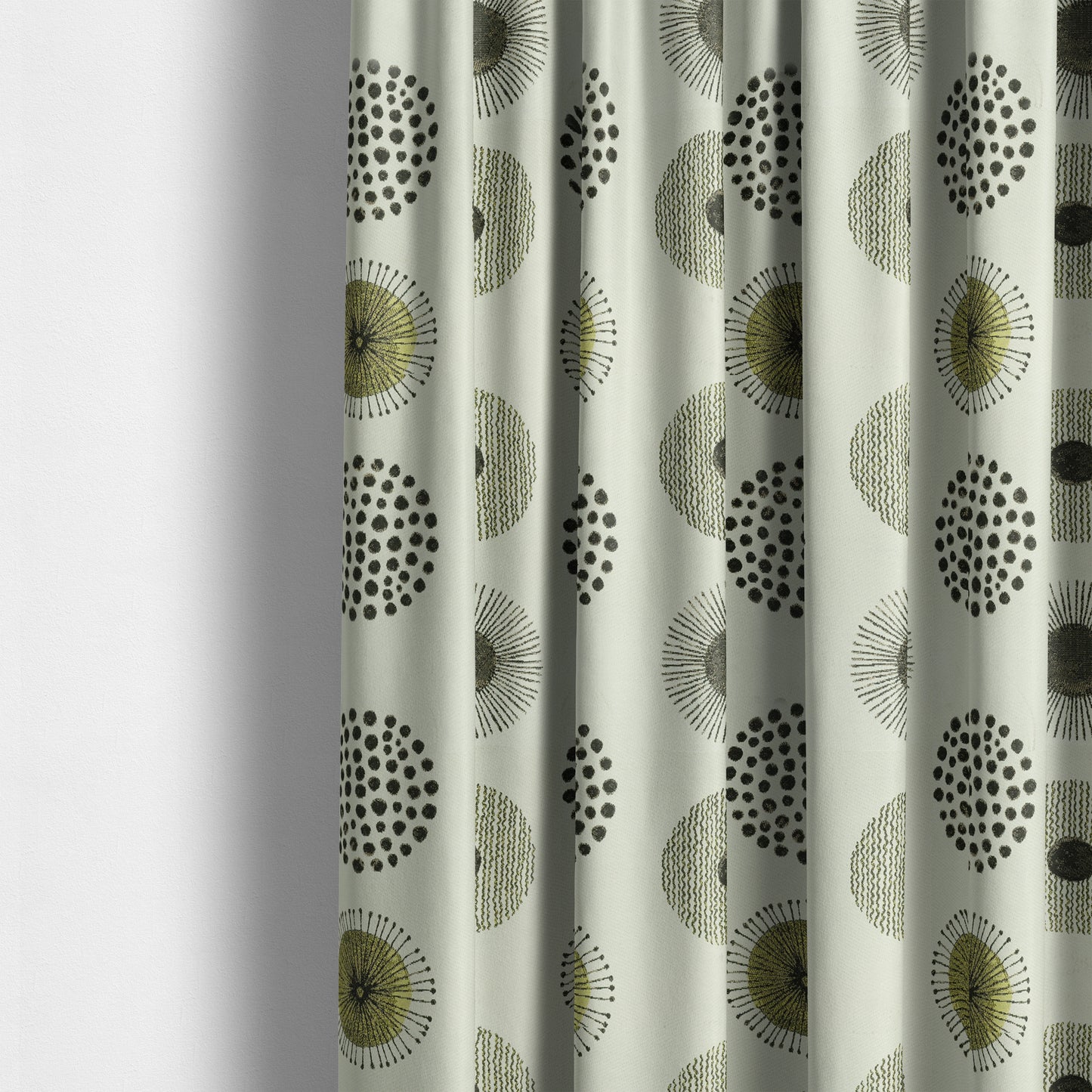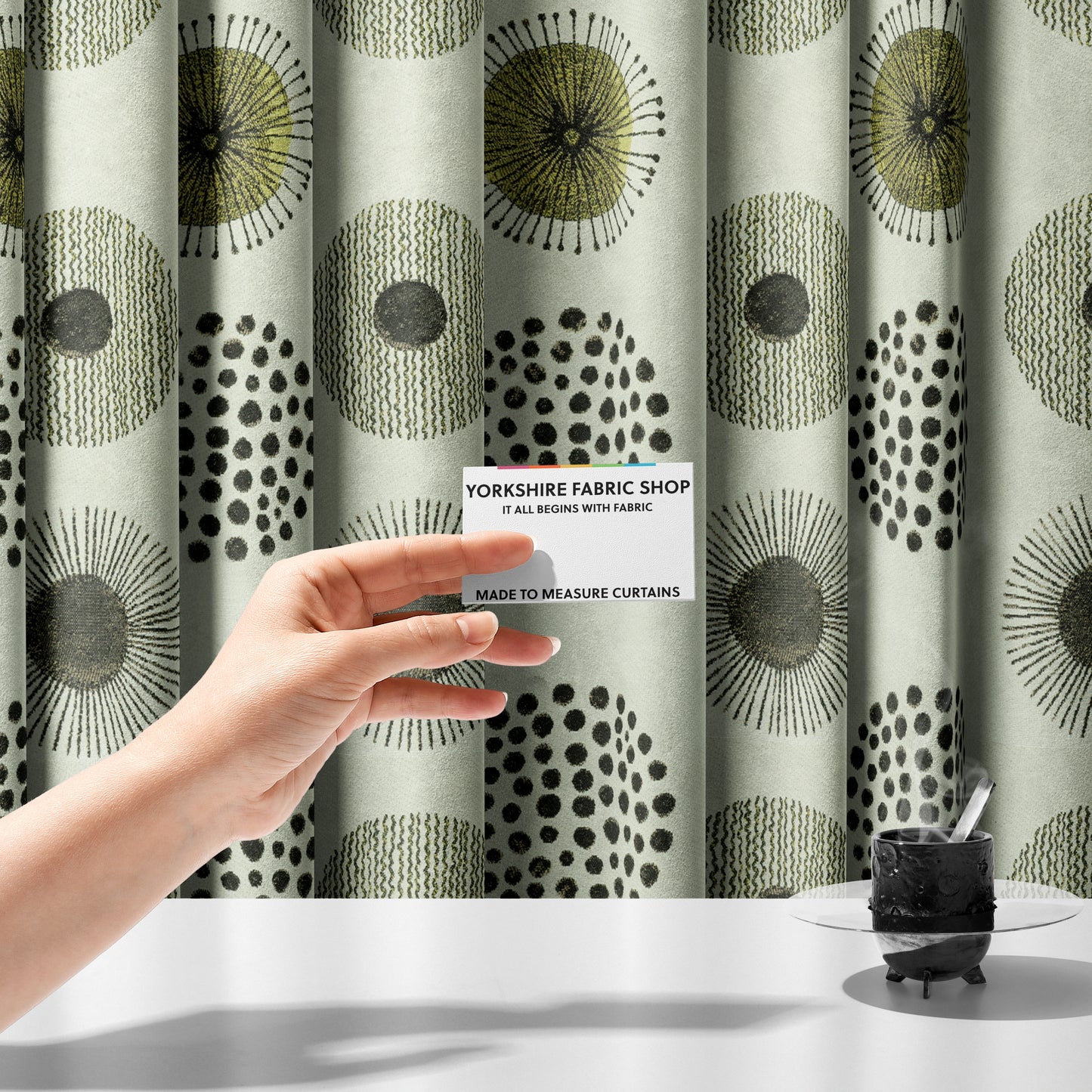This made-to-measure chenille upholstery fabric features a funky geometric design in shades of green, black, and cream. Perfect for adding a unique touch to your curtains or home decor, this fabric is both stylish and durable. Create a statement piece with confidence.