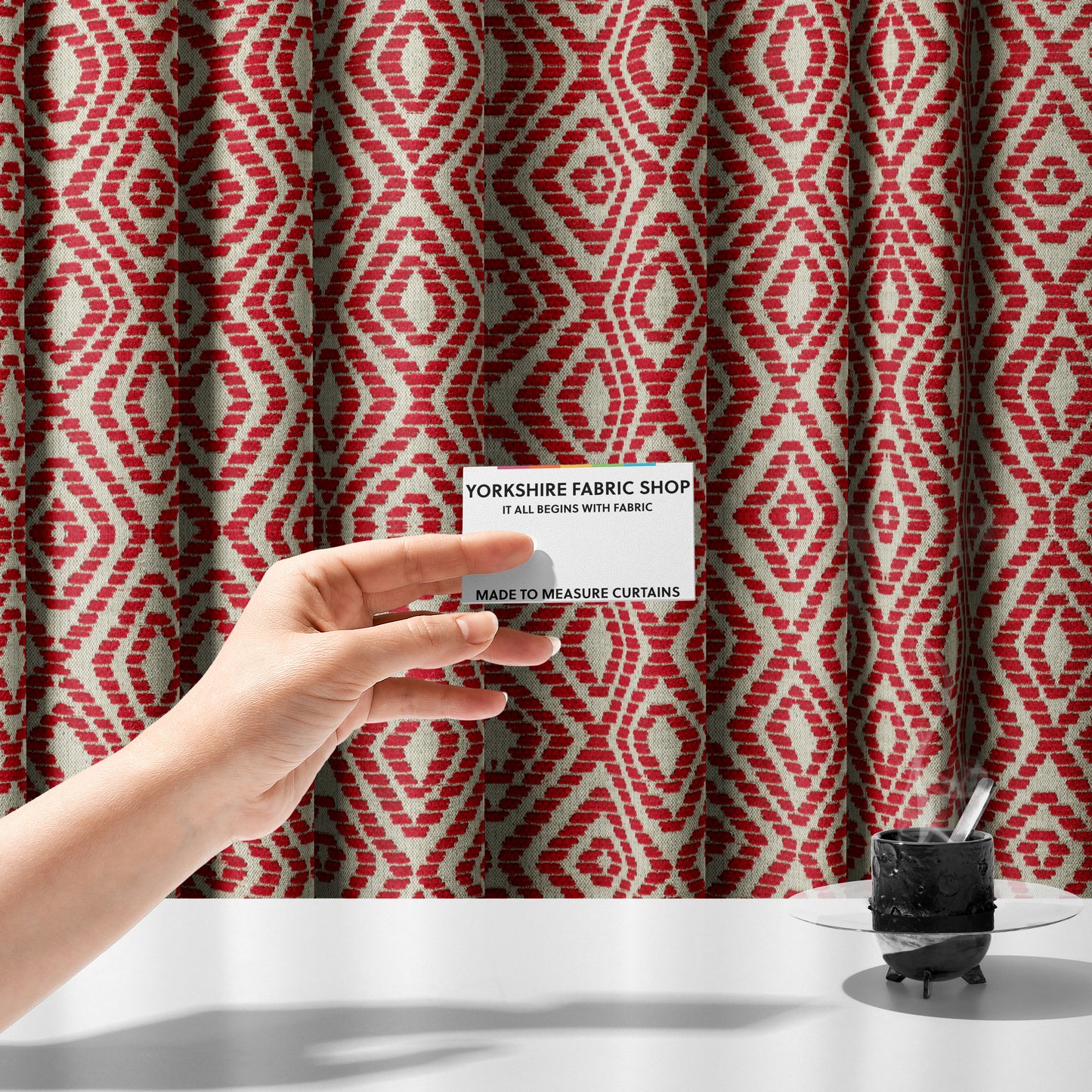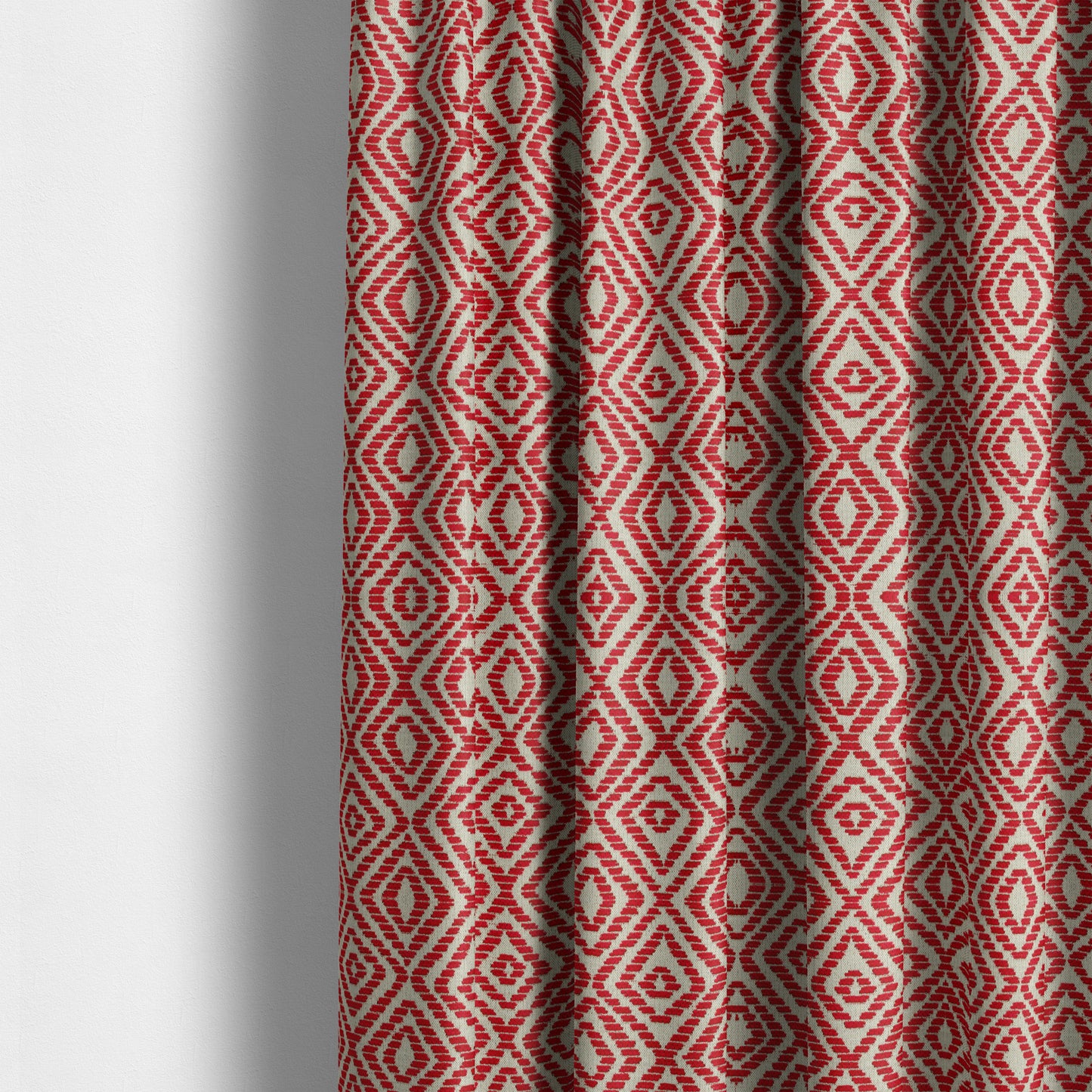 Enhance your home decor with our modern chenille upholstery fabric. Our geometric diamond pattern in red exudes warmth and sophistication. Made to measure curtains provide a perfect fit every time. Elevate any room with this stylish and high-quality fabric.