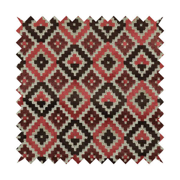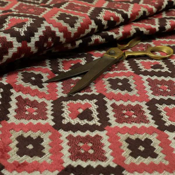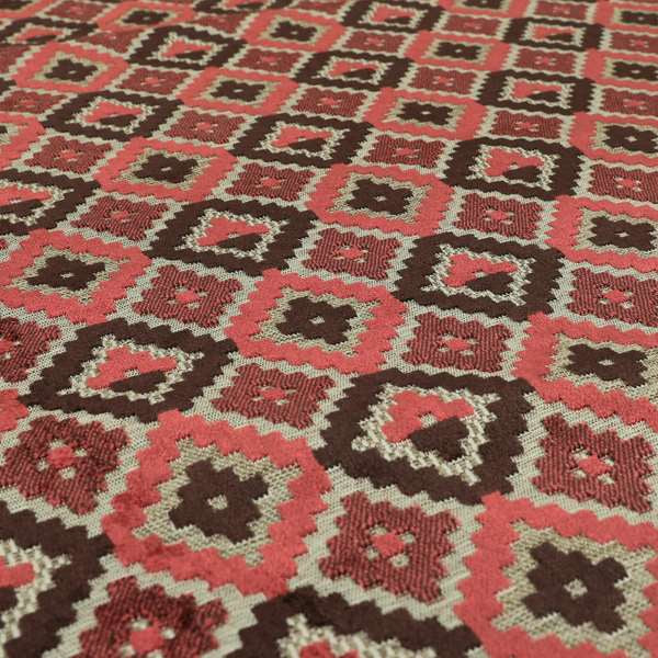 This cut velvet upholstery fabric features a bold geometric quadrilateral pattern in pink and purple, perfect for creating stylish and modern Roman blinds. The luxurious material adds a touch of elegance to any room, while the unique design adds interest and depth. Elevate your home decor with this high-quality fabric.