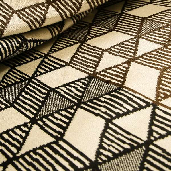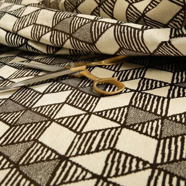 Enhance your home decor with our geometric triangles velvet upholstery fabric. This cream, brown and black fabric features a modern and stylish design of geometric triangles, perfect for adding a touch of sophistication to any room. Soft and luxurious, this fabric is perfect for creating elegant Roman blinds.