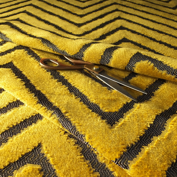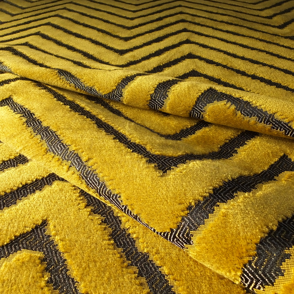Update your home decor with our luxurious Golden yellow chevron velvet upholstery fabric. Featuring a bold chevron pattern and a rich golden yellow colour, this fabric is perfect for adding a touch of elegance to any room. Made with high-quality materials, it provides both style and durability.