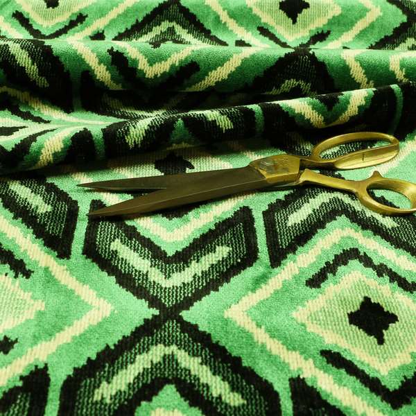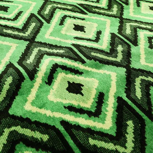 This Green black cream colour squared geometric pattern soft velvet upholstery fabric is perfect for creating elegant Roman blinds. The unique squared geometric pattern adds a touch of sophistication to any interior design. Crafted with soft velvet, this fabric offers both style and comfort.