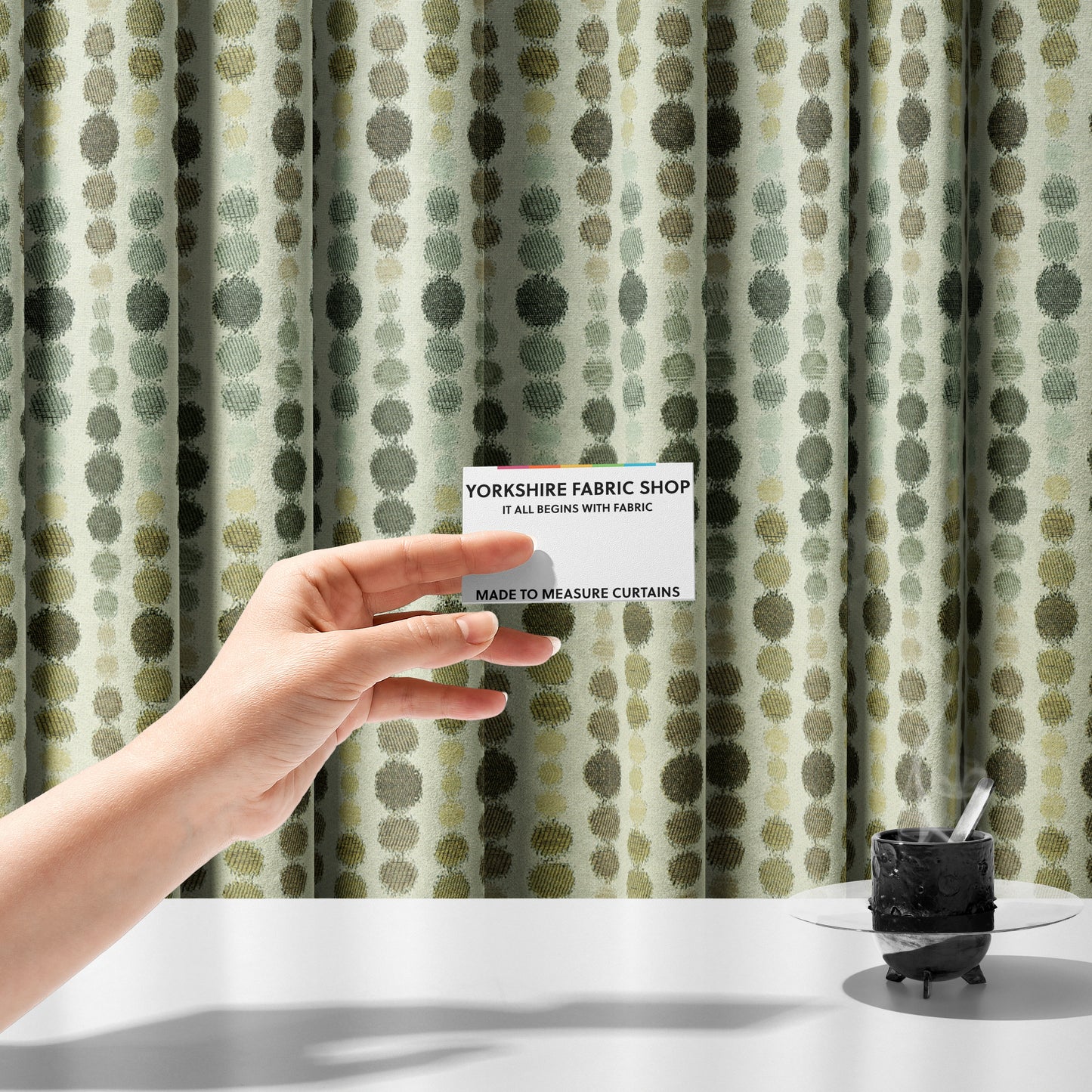 This chenille upholstery fabric features a stylish green and brown dotted geometric pattern, perfect for adding a touch of sophistication to your home decor. The high-quality material ensures long-lasting durability and the made-to-measure option allows for a customized fit. Elevate your space with these elegant curtains.