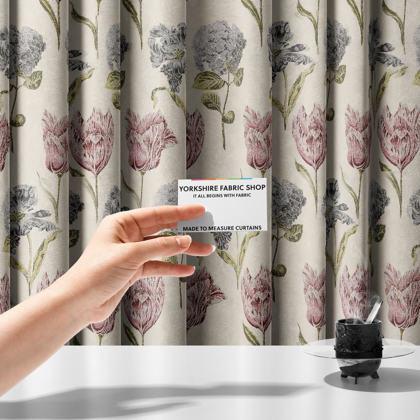 Expertly crafted in a beautiful green, purple, and pink floral theme, this chenille upholstery fabric is the perfect choice for your custom made curtains. The luxurious fabric not only adds a touch of elegance to your decor, but also ensures durability and easy maintenance. Elevate your space with this stunning fabric today.