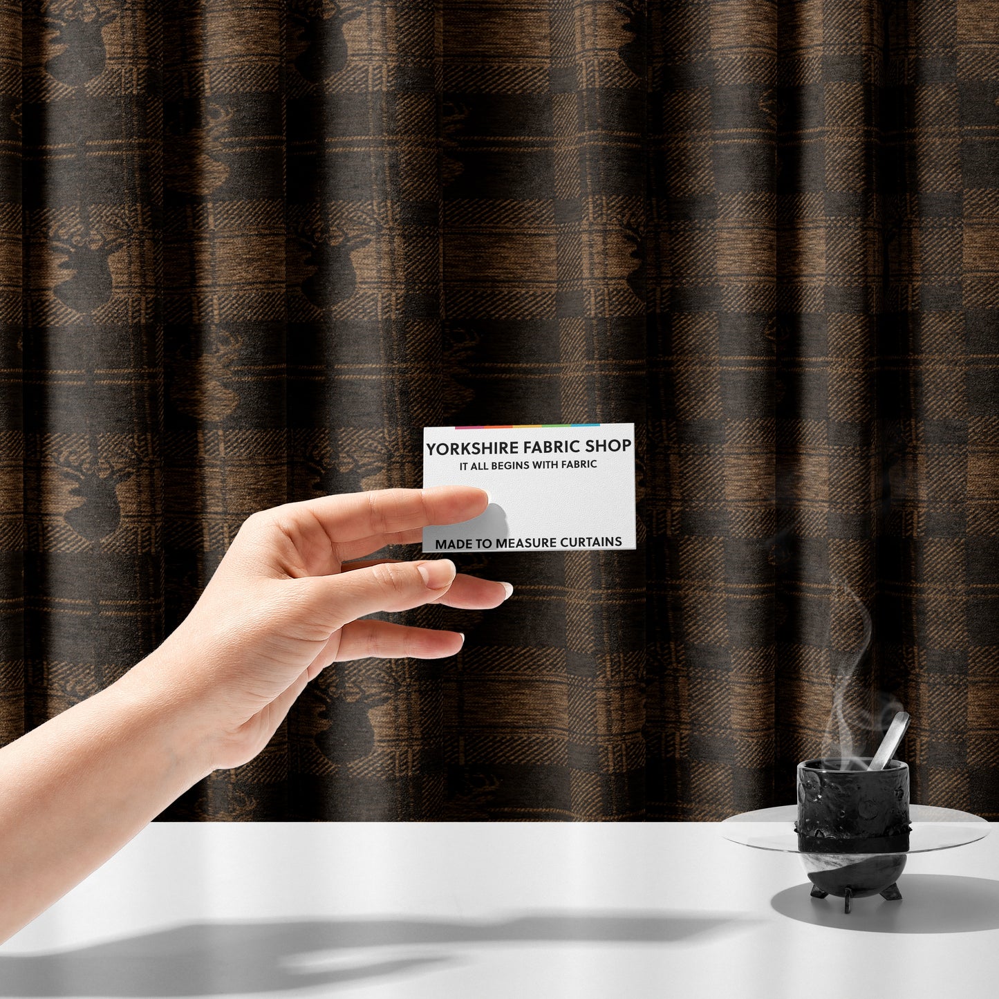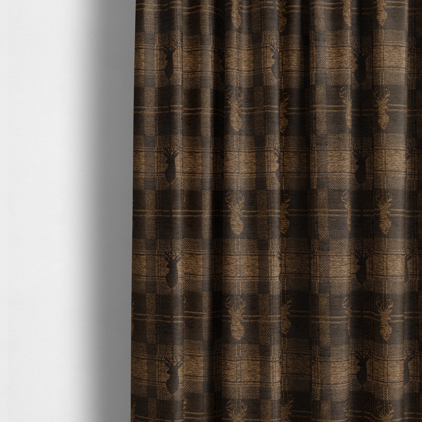 Experience luxury and sophistication with our Highland collection curtains. Made from soft, cotton-like chenille, they feature a stunning stag head animal design on a rich, chocolate brown checked background. Elevate your home decor with these made-to-measure curtains for a stylish and customized touch.