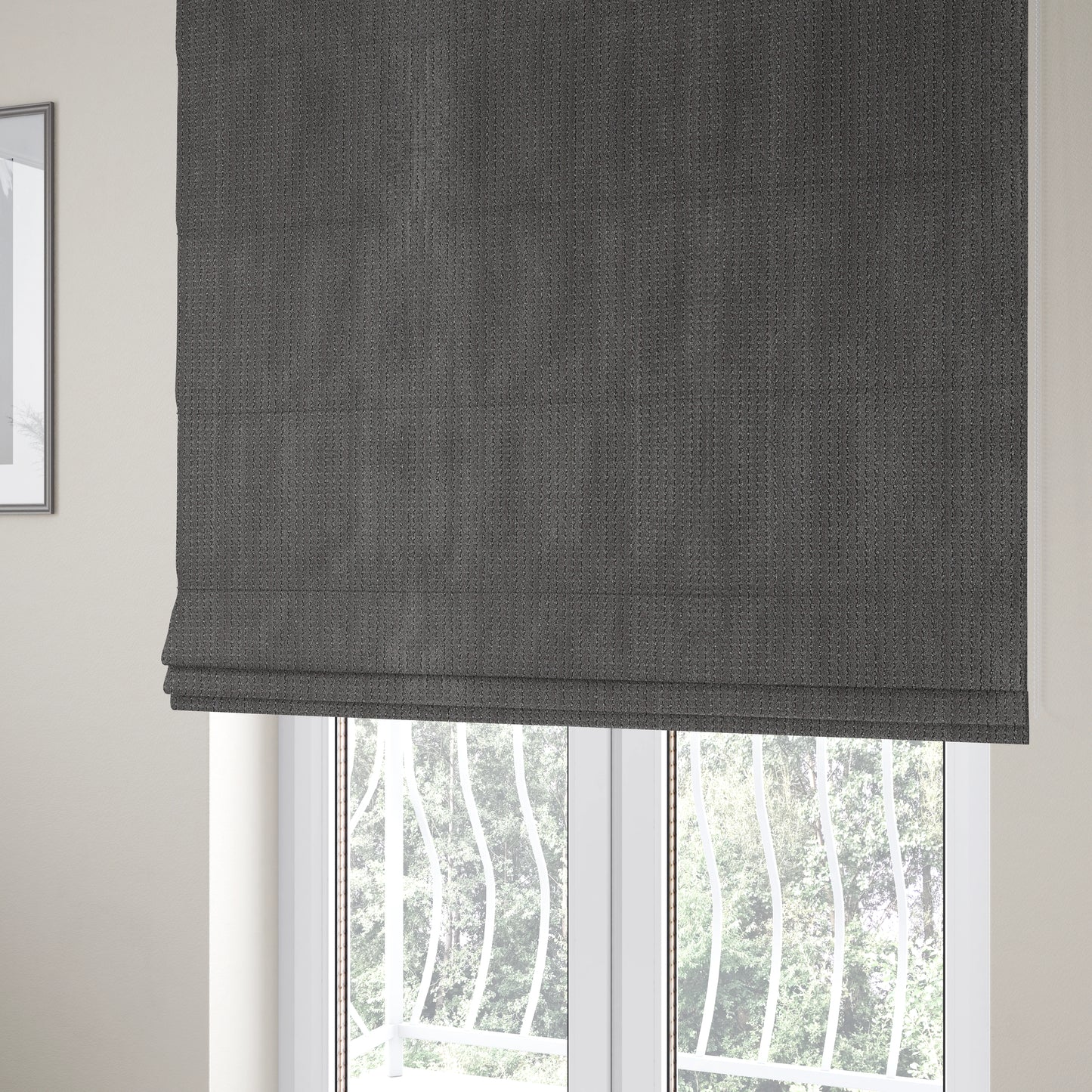 Enhance the look of your home with our Ilford plush wave ripple effect corduroy upholstery fabric in a sleek charcoal grey colour. Perfect for Roman blinds, this fabric adds a touch of sophistication and texture to any room. Made with durability in mind, it will provide both style and functionality for years to come.