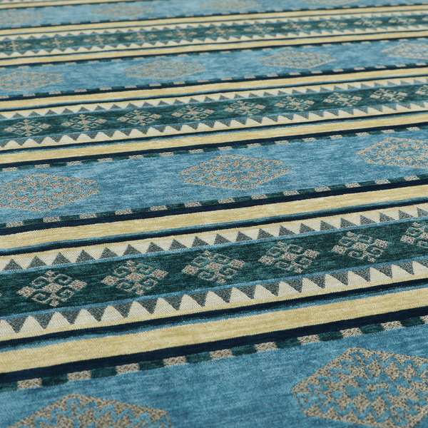 Expertly designed, the Jaipur kilim aztec Roman blinds feature a striking blue, teal, and silver aztec pattern with bold stripes. Made with premium quality fabric, these blinds add a touch of elegance to any room. Transform your space with this unique and stylish furnishing.