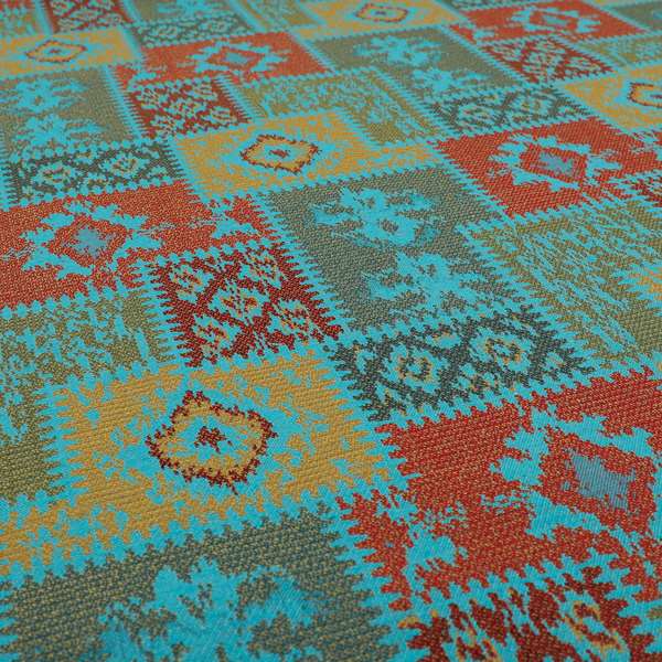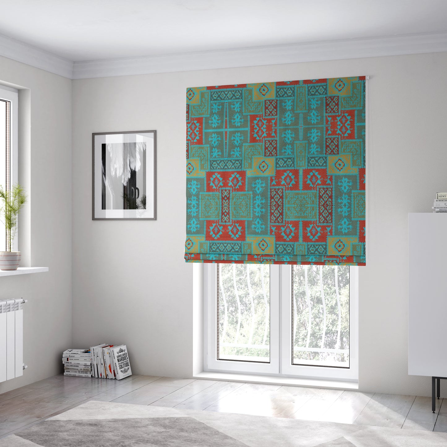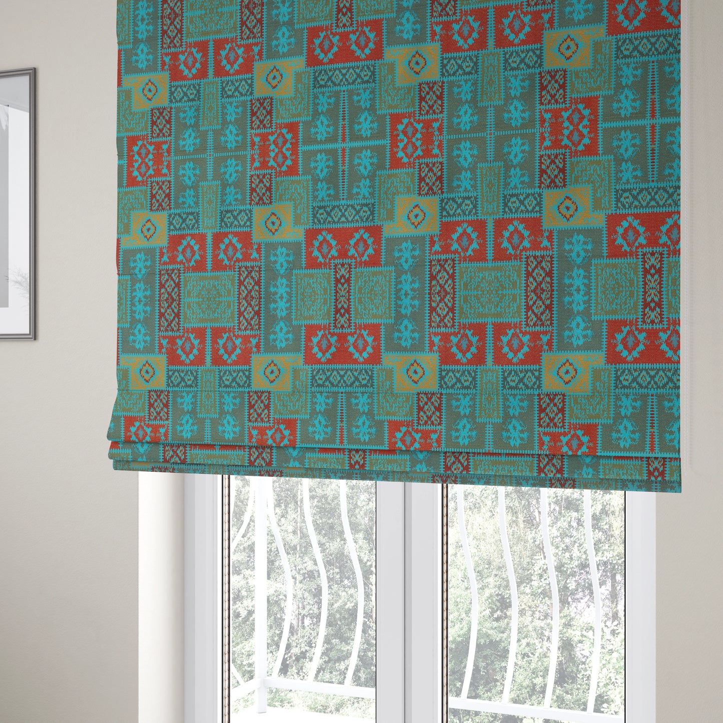 Introducing the Jayapura Collection of kilim patchwork heavyweight chenille teal blue multi colour upholstery fabric ctr-326. This durable and versatile fabric is perfect for creating Roman blinds that will add a touch of sophistication to any room. With its unique patchwork design and heavy chenille texture, it is sure to elevate your home decor.