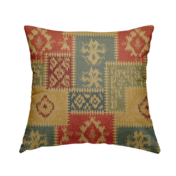 Enhance your decor with the Jayapura collection of kilim patchwork heavyweight chenille yellow multi colour upholstery fabric. Handmade cushions add a touch of unique style while the heavy-duty chenille fabric ensures durability. Expertly crafted, this fabric offers both style and function.
