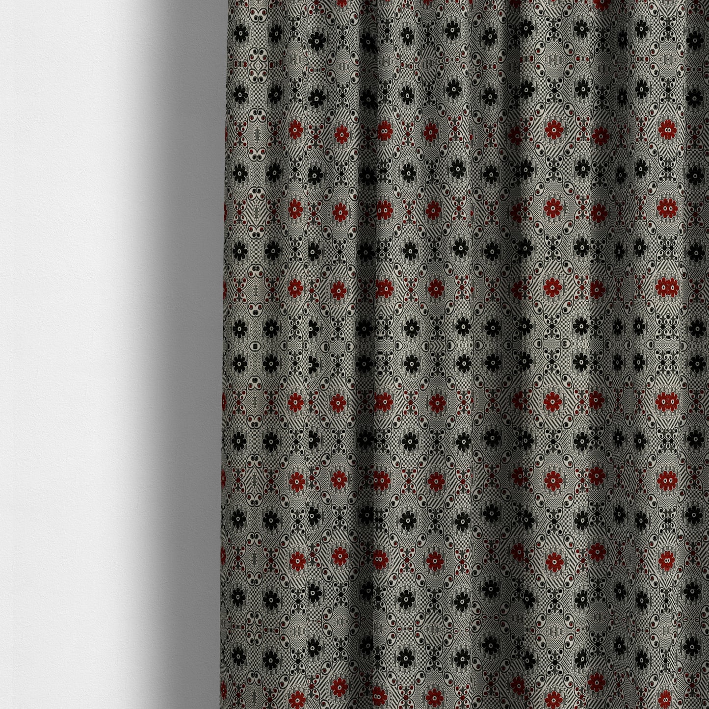 Enhance the elegance of your living space with Kodiak's texturized glitter upholstery fabric. Featuring a small floral pattern in black, red, and silver, this fabric is perfect for creating custom-made curtains. Enjoy the durability and style of Kodiak's high-quality furnishing fabric.