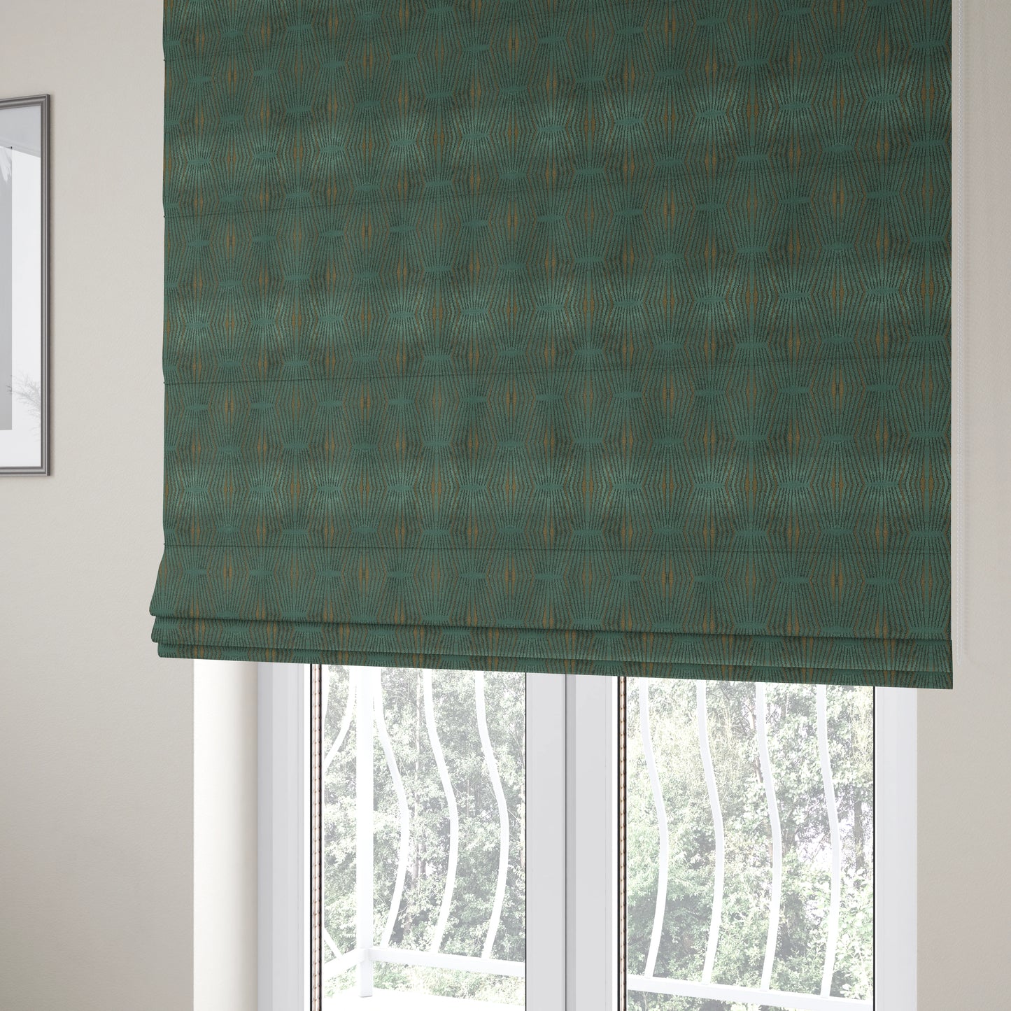 Transform any room into a luxurious space with our Kyoto argyle geometric pattern velvet fabric Roman blinds. The stunning teal and orange colour combination adds a vibrant touch, while the soft velvet fabric provides ultimate comfort. Elevate your home decor with these stylish and functional blinds.